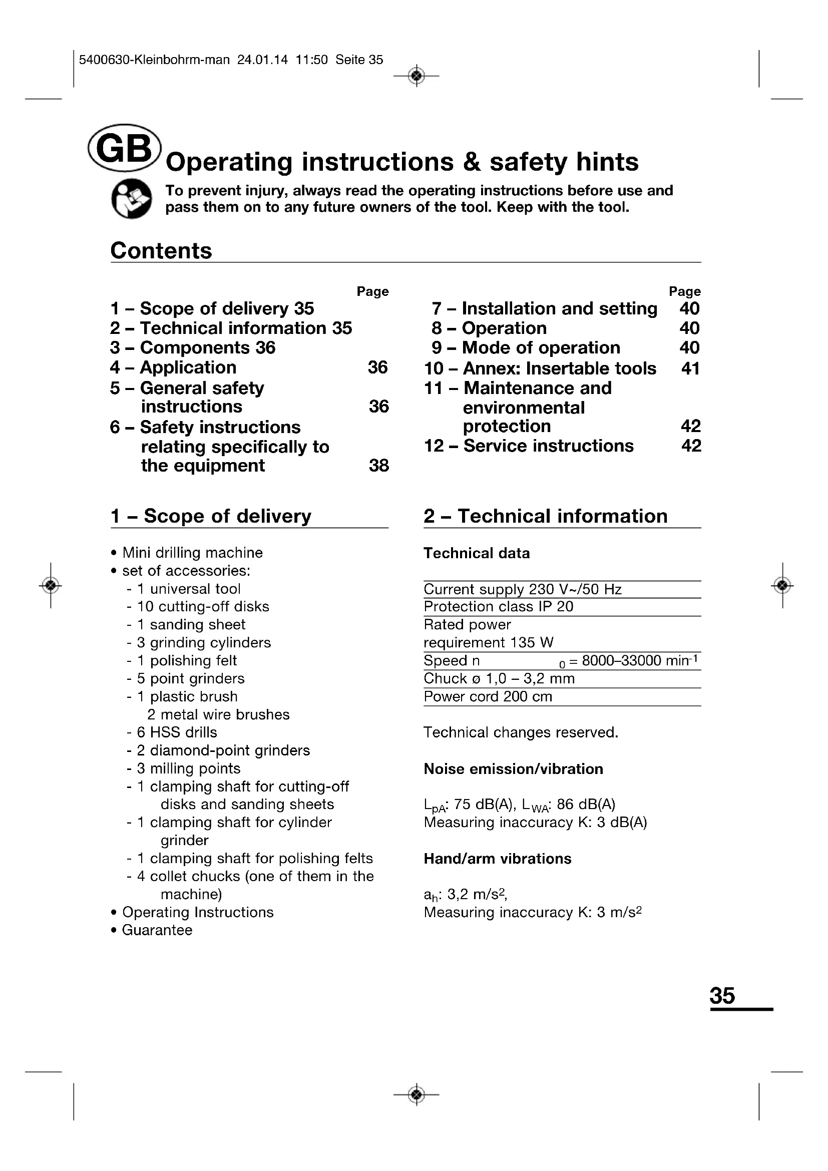 Page 1 – Scope of delivery 35 2 – Technical information 35 3 – Components 36 4 – Application 36 5 – General safety instructions 36 6 – Safety instructions relating specifically to the equipment 38 Page 7 – Installation and setting 40 8 – Operation 40 9 – Mode of operation 40 10 – Annex: Insertable tools 41 11 – Maintenance and environmental protection 42 12 – Service instructions 42 Contents