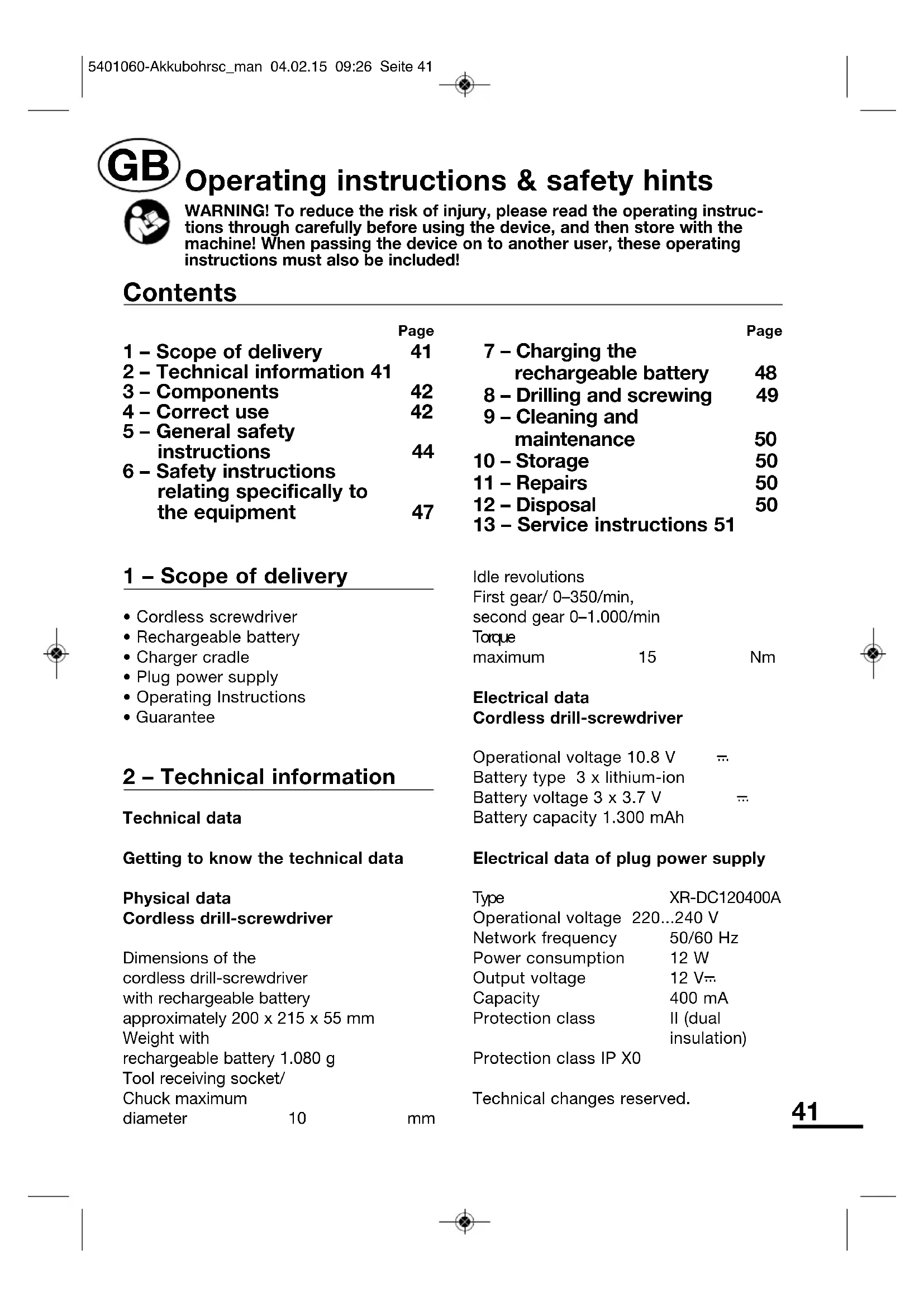 Capacity 400 mAProtection class II (dualinsulation)Protection class IP X0Technical changes reserved. Page 1 – Scope of delivery 41 2 – Technical information 41 3 – Components 42 4 – Correct use 42 5 – General safety instructions 44 6 – Safety instructions relating specifically to the equipment 47 Page 7 – Charging the rechargeable battery 48 8 – Drilling and screwing 49 9 – Cleaning and maintenance 50 10 – Storage 50 11 – Repairs 50 12 – Disposal 50 13 – Service instructions 51 Contents Operating instructions & safety hints WARNING! To reduce the risk of injury, please read the operating instruc-tions through carefully before using the device, and then store with themachine! When passing the device on to another user, these operatinginstructions must also be included!