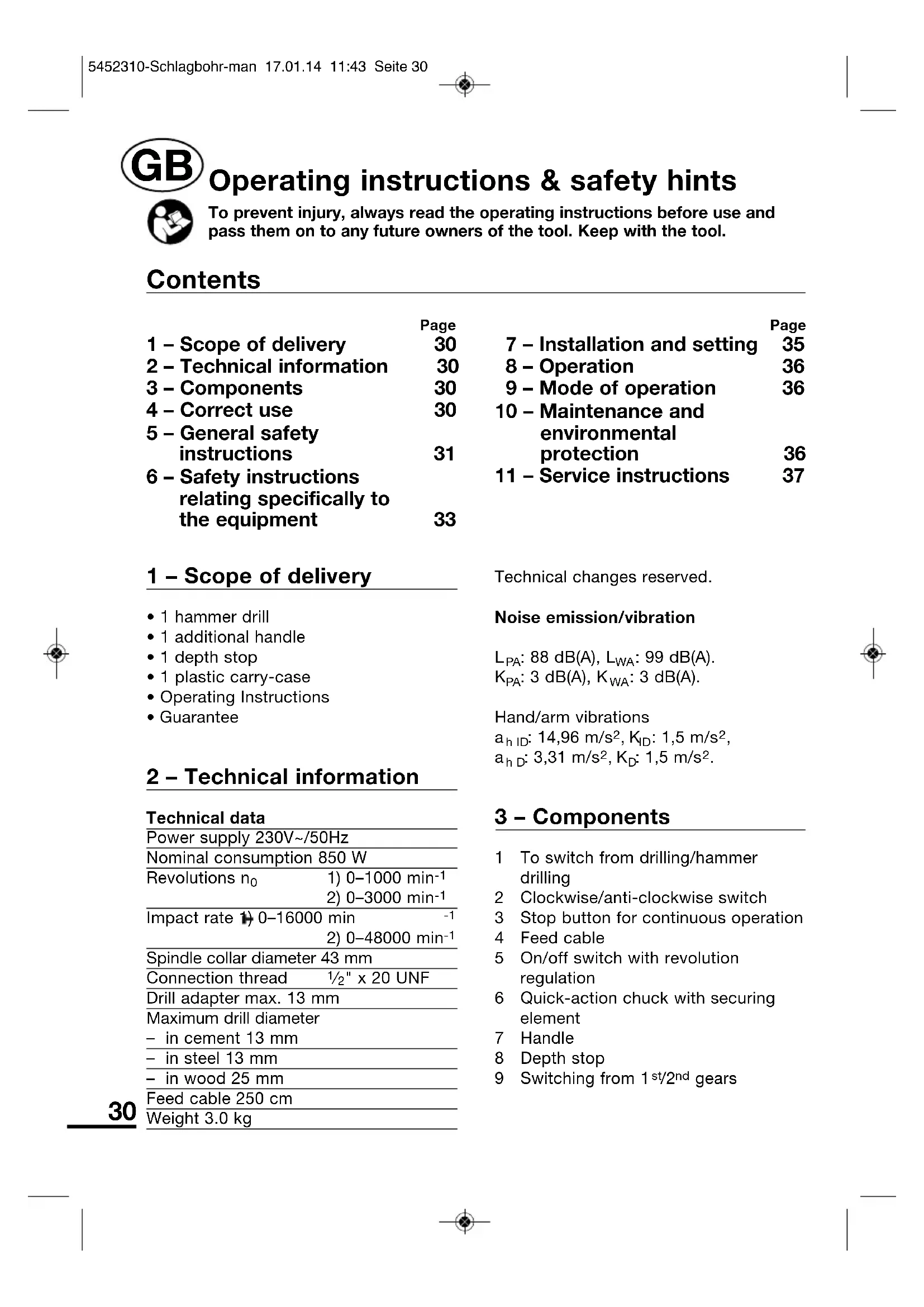 - Even after the expiry of the guarantee period, we would like to help you and carry out any repairs at a favourable price. 5452310-Schlagbohr-man 17.01.14 11:43 Seite 3738 1 – Omvang van de levering
