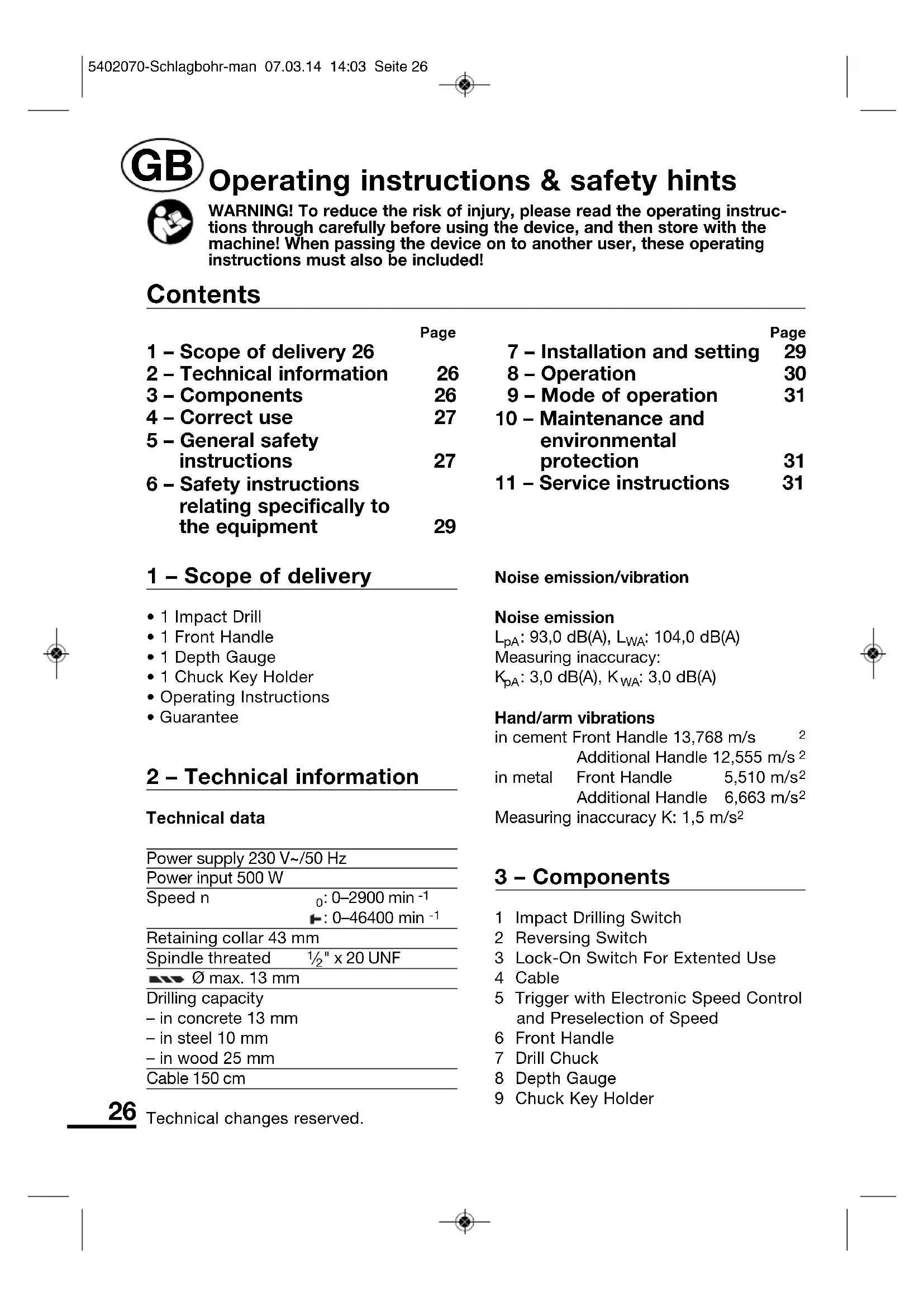 3 – Components 1 Impact Drilling Switch2 Reversing Switch3 Lock-On Switch For Extented Use4Cable5 Trigger with Electronic Speed Controland Preselection of Speed6 Front Handle7 Drill Chuck8 Depth Gauge9 Chuck Key Holder Operating instructions & safety hints WARNING! To reduce the risk of injury, please read the operating instruc-tions through carefully before using the device, and then store with themachine! When passing the device on to another user, these operatinginstructions must also be included!