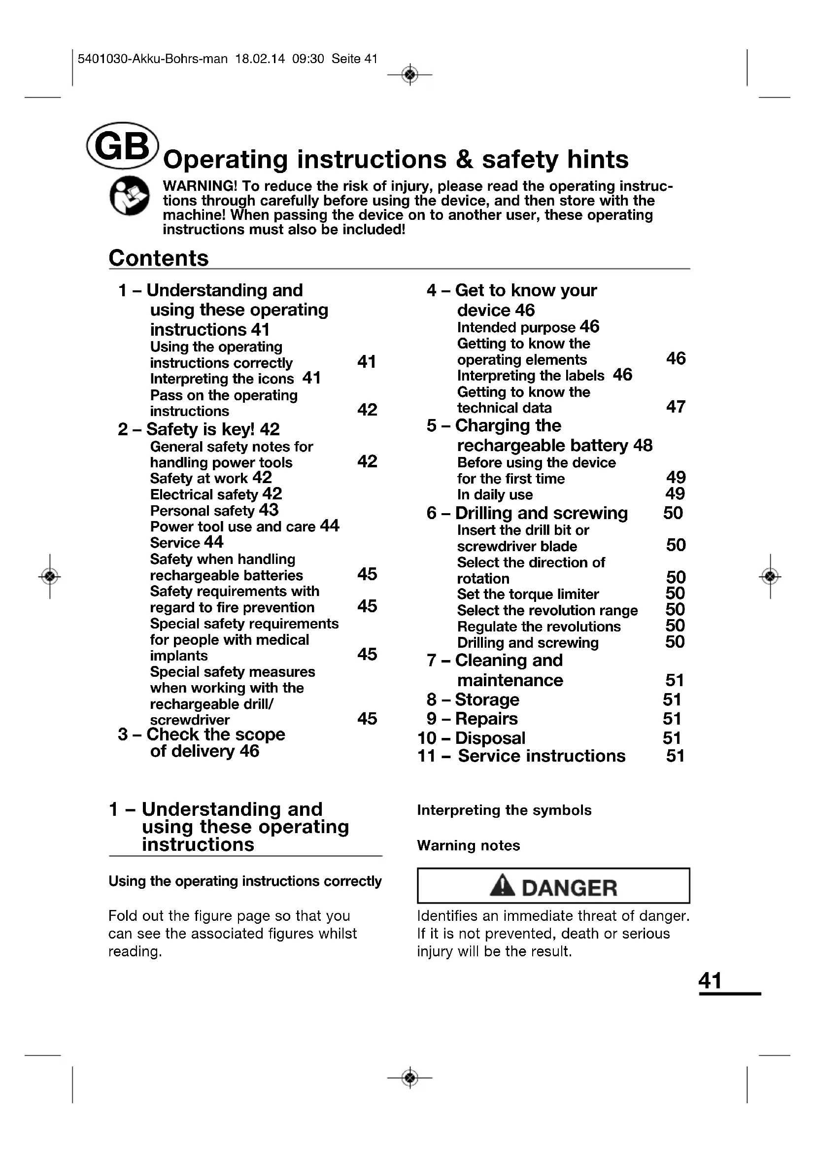 5401030-Akku-Bohrs-man 18.02.14 09:30 Seite 4041 1 – Understanding and using these operating instructions Using the operating instructions correctlyFold out the figure page so that youcan see the associated figures whilstreading.Interpreting the symbolsWarning notesIdentifies an immediate threat of danger.If it is not prevented, death or seriousinjury will be the result. 1 – Understanding and using these operating instructions 41 Using the operatinginstructions correctly Interpreting the icons 41Pass on the operatinginstructions