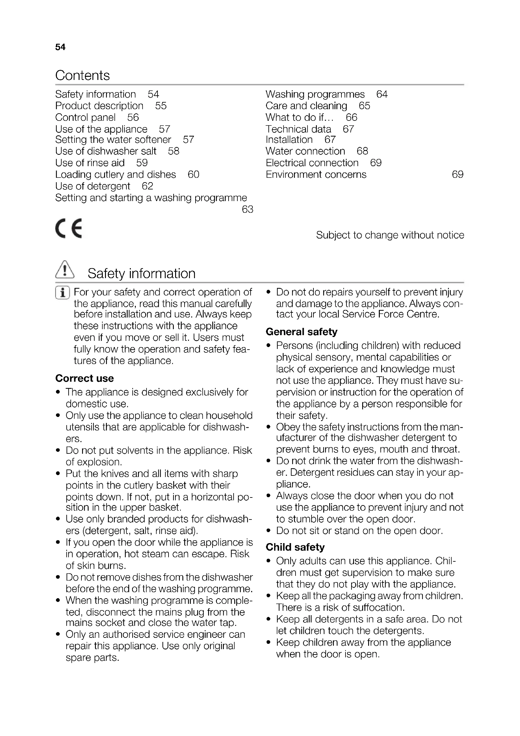 Washing programmes 64 Care and cleaning 65 What to do if… 66 Technical data 67 Installation 67 Water connection 68 Electrical connection 69 Environment concerns 69 Subject to change without notice Safety information For your safety and correct operation of the appliance, read this manual carefully before installation and use. Always keep these instructions with the appliance even if you move or sell it. Users must fully know the operation and safety fea- tures of the appliance. Correct use