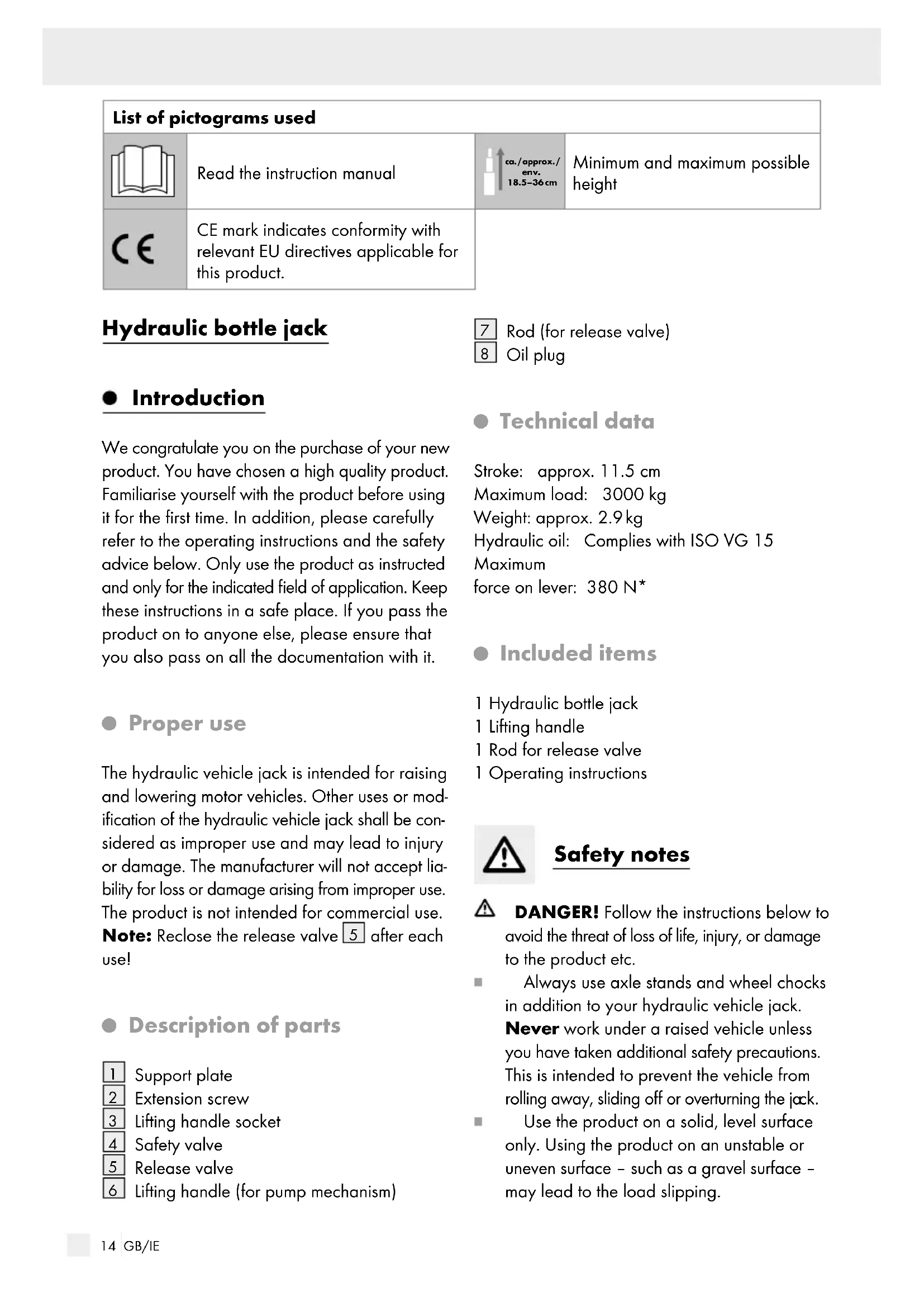 Included items 1 Hydraulic bottle jack 1 Lifting handle 1 Rod for release valve 1 Operating instructions Safety notes DANGER! Follow the instructions below to avoid the threat of loss of life, injury, or damage to the product etc. Always use axle stands and wheel chocks in addition to your hydraulic vehicle jack. Never work under a raised vehicle unless you have taken additional safety precautions. This is intended to prevent the vehicle from rolling away, sliding off or overturning the ja ck. Use the product on a solid, level surface only. Using the product on an unstable or uneven surface – such as a gravel surface – may lead to the load slipping.15 GB/IE Ensure that you never exceed the allowable (rated) load capacity. The person operating the jack must observe the jack and the load during all movements. Never work under the raised load if it has not been made secure by suitable means. Do not allow the hydraulic vehicle jack to be used by uninstructed or inexperienced persons. Before using the hydraulic vehicle jack take precautions to prevent the vehicle from roll- ing away. Put the handbrake on, place the vehicle in gear (with automatic gearboxes set to “P”) and chock the wheels. Even with safety measures in place always remain alert and make a visual check that the support plate
