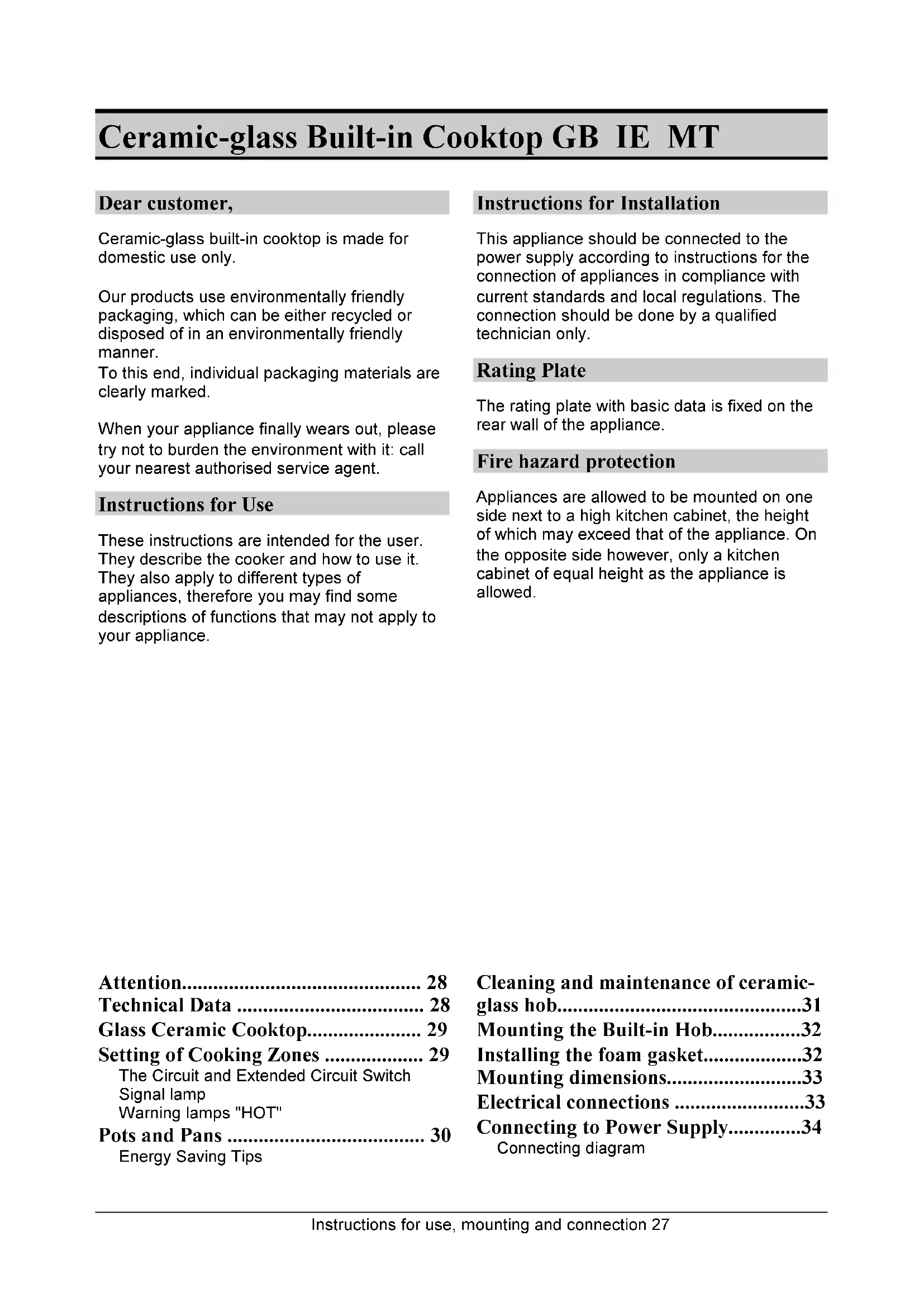 - BEEINFLUSSEN, BLEIBEN VORBEHALTEN.Instructions for use, mounting and connection 27 Ceramic-glass Built-in Cooktop GB IE MT Dear customer, Ceramic-glass built-in cooktop is made for domestic use only. Our products use environmentally friendly packaging, which can be either recycled or disposed of in an environmentally friendly manner. To this end, individual packaging materials are clearly marked. When your appliance finally wears out, please try not to burden the environment with it: call your nearest authorised service agent. Instructions for Use These instructions are intended for the user. They describe the cooker and how to use it. They also apply to different types of appliances, therefore you may find some descriptions of functions that may not apply to your appliance. Instructions for Installation This appliance should be connected to the power supply according to instructions for the connection of appliances in compliance with current standards and local regulations. The connection should be done by a qualified technician only. Rating Plate The rating plate with basic data is fixed on the rear wall of the appliance. Fire hazard protection Appliances are allowed to be mounted on one side next to a high kitchen cabinet, the height of which may exceed that of the appliance. On the opposite side however, only a kitchen cabinet of equal height as the appliance is allowed. Attention p. 28