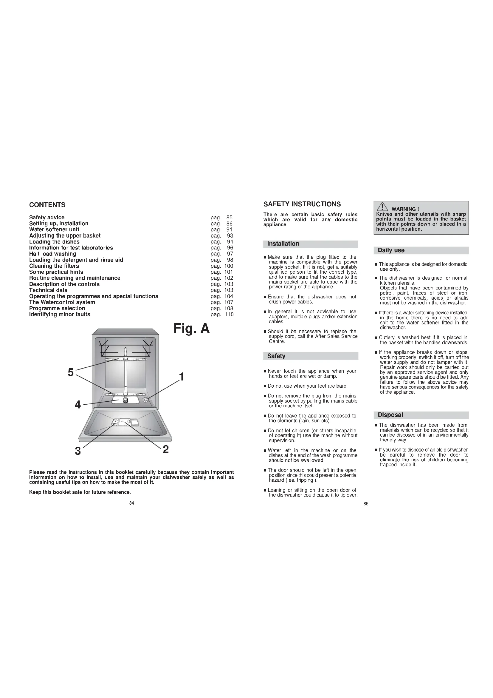 CONTENTS Safety advice Setting up, installation Water softener unit Adjusting the upper basket Loading the dishes Information for test laboratories Half load washing Loading the detergent and rinse aid Cleaning the filters Some practical hints Routine cleaning and maintenance Description of the controls Technical data Operating the programmes and special functions The Watercontrol system Programme selection Identifying minor faults pag. 85 pag. 86 pag. 91 pag. 93 pag. 94 pag. 96 pag. 97 pag. 98 pag. 100 pag. 101 pag. 102 pag. 103 pag. 103 pag. 104 pag. 107 pag. 108 pag. 110 Please read the instructions in this booklet carefully because they contain importantinformation on how to install, use and maintain your dishwasher safely as well ascontaining useful tips on how to make the most of it.Keep this booklet safe for future reference. Fig. A