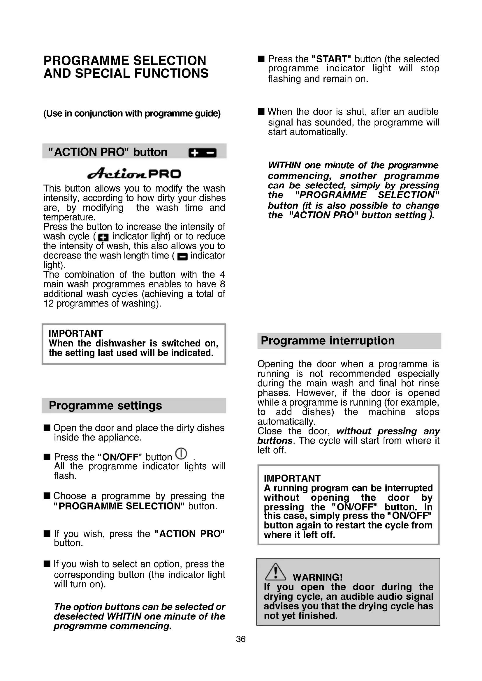 (Use in conjunction with programme guide) "ACTION PRO" button This button allows you to modify the wash intensity, according to how dirty your dishes are, by modifying the wash time and temperature. Press the button to increase the intensity of wash cycle ( indicator light) or to reduce the intensity of wash, this also allows you to decrease the wash length time ( indicator light). The combination of the button with the 4 main wash programmes enables to have 8 additional wash cycles (achieving a total of 12 programmes of washing). IMPORTANT When the dishwasher is switched on, the setting last used will be indicated. Programme settings ■ Open the door and place the dirty dishes inside the appliance. ■ Press the "ON/OFF" button . All the programme indicator lights will flash. ■ Choose a programme by pressing the "PROGRAMME SELECTION" button. ■ If you wish, press the "ACTION PRO" button. ■ If you wish to select an option, press the corresponding button (the indicator light will turn on). The option buttons can be selected or deselected WHITIN one minute of the programme commencing. ■ Press the "START" button (the selected programme indicator light will stop flashing and remain on. ■ When the door is shut, after an audible signal has sounded, the programme will start automatically. WITHIN one minute of the programme commencing, another programme can be selected, simply by pressing the "PROGRAMME SELECTION" button (it is also possible to change the "ACTION PRO" button setting ). Programme interruption Opening the door when a programme is running is not recommended especially during the main wash and final hot rinse phases. However, if the door is opened while a programme is running (for example, to add dishes) the machine stops automatically. Close the door, without pressing any buttons. The cycle will start from where it left off. IMPORTANT A running program can be interrupted without opening the door by pressing the "ON/OFF" button. In this case, simply press the "ON/OFF" button again to restart the cycle from where it left off. WARNING! If you open the door during the drying cycle, an audible audio signal advises you that the drying cycle has not yet finished.37 Changing a running programme Proceed as follows to change or cancel a running program: ■ Hold the "RESET" button down for at least 5 seconds. The programme indicator lights will turn on and off individually and sequentially and some audible signals will sound. ■ The running programme will be cancelled and all the programme indicator lights will flash. ■ At this point a new programme can be set. WARNING! Before starting a new programme, you should check that there is still detergent in the dispenser. If necessary, top up the dispenser. Programme operations When a programme is running the relevant indicator light will remain on and the 3 “PROGRAMME STATUS” indicator lights ("WASH" , "DRY" , and "END" ) will light singularly and in sequence to indicate the current phase. If there is any break in the power supply while the dishwasher is operating, a special memory stores the selected programme and, when the power is restored, it continues where it left off. Programme end A 5 second alarm will sound (if not muted) 3 times at 30 second intervals to signal that the programme has ended. The programme end indicator light will turn on, while all the others indicator lights will turn off. Dishes can now be removed and the dishwasher turned off by pressing the "ON/OFF" button or dishes can be loaded for new cycle. Option buttons "SUPER ECO" button This button provides an energy and time saving of 25% on average (according to the select cycle) reducing the wash water temperature and the drying time during the final rinse. This programme is recommended for light soil washes, and for slightly wet dishes that are not fully dry, & improved drying results. We advise you to leave the door of the Dishwasher half-open at the end of the cycle, to allow for a natural circulation of air inside the dishwasher. "ALL in 1" button This option optimises the use of "ALL in 1" ("3 in 1"/"4 in 1"/"5 in 1", ecc.) combined detergents. By pressing this button, the selected washing programme is modified to get best performance from combined detergents (furthermore, the salt aid shortage light is de-activated). WARNING! Once selected, this option keeps being on (light on) also for next washing cycles and it can be de-activate (light off) only by pressing the button once again. IMPORTANT When this option is selected, the "RAPID" cycle is 10 minutes longer.38 "DELAY START" button The dishwasher start time can be set with this button, delaying the start by 3, 6 or 9 hours. Proceed as follows to set a delayed start: ■ Press the "DELAY START" button (each time the button is pressed the start will be delayed by 3, 6 or 9 hours respectively and the corresponding time indicator light will illuminate). ■ To start the countdown, press the "START" button (the selected programme indicator light will come on, while the set time indicator light will start to flash). If a 9 hour delay is set, countdown will be displayed by the 6h indicator light after 3 hours and the 3h indicator light after 6 hours. At the end of the last 3 hours (at the end of countdown) the 3h indicator light will stop flashing and remain on to indicate the washing phase and the programme will start automatically. If countdown has not ended, whereby the programme has not yet started, it is possible to change or cancel the delayed start and select another programme or to select/deselect the option button, proceeding as follows: ■ Hold the "RESET" button down for at least 5 seconds. The programme indicator lights will turn on and off individually and sequentially and some audible signals will sound. ■ The delayed start and the selected programme will be cancelled. The programme indicator lights will flash. ■ Press the "DELAY START" button to set another delayed start time (the corr