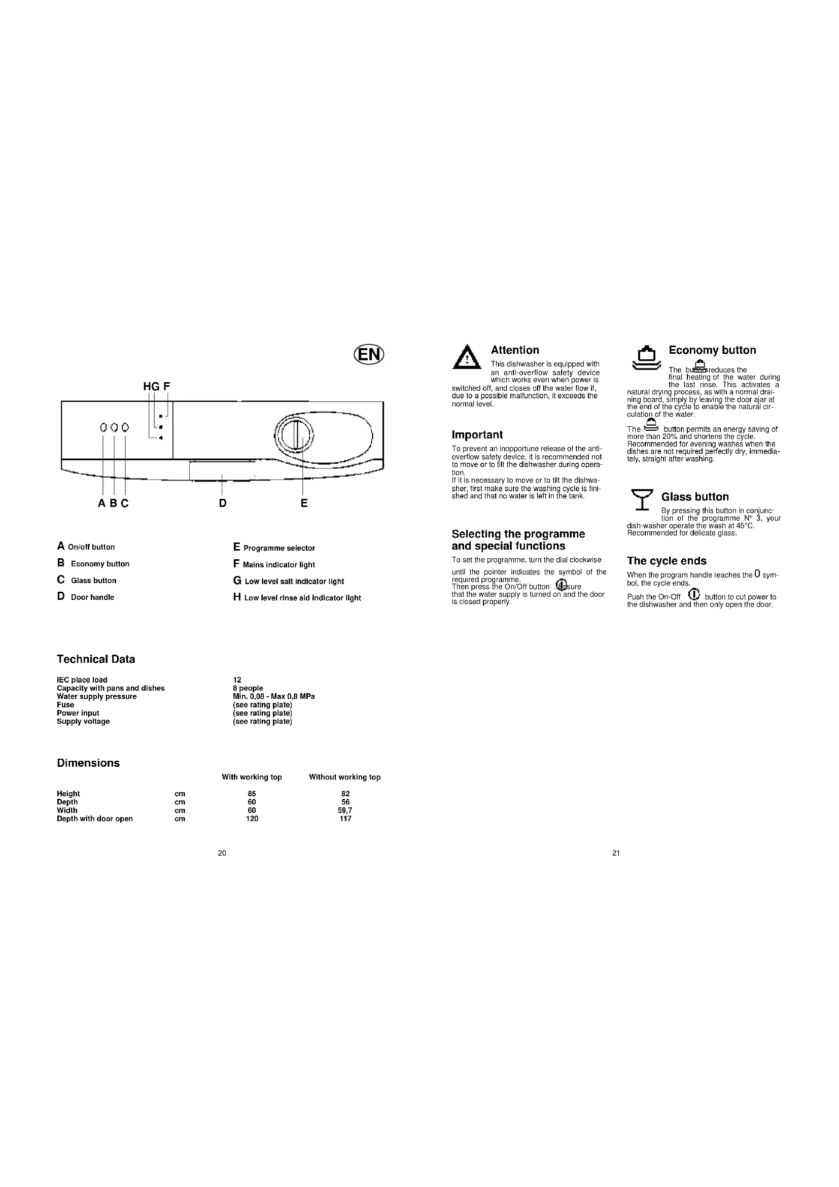 Attention This dishwasher is equipped with an anti-overflow safety device which works even when power is switched off, and closes off the water flow if, due to a possible malfunction, it exceeds the normal level. Important To prevent an inopportune release of the anti- overflow safety device, it is recommended not to move or to tilt the dishwasher during opera- tion. If it is necessary to move or to tilt the dishwa- sher, first make sure the washing cycle is fini- shed and that no water is left in the tank. Selecting the programme and special functions To set the programme, turn the dial clockwise until the pointer indicates the symbol of the required programme. Then press the On/Off button . Ensure that the water supply is turned on and the door is closed properly. Economy button The button reduces the final heating of the water during the last rinse. This activates a natural drying process, as with a normal drai- ning board, simply by leaving the door ajar at the end of the cycle to enable the natural cir- culation of the water. The button permits an energy saving of more than 20% and shortens the cycle. Recommended for evening washes when the dishes are not required perfectly dry, immedia- tely, straight after washing. Glass button By pressing this button in conjunc- tion of the programme N° 3, your dish-washer operate the wash at 45°C. Recommended for delicate glass. The cycle ends When the program handle reaches the 0 sym- bol, the cycle ends. Push the On-Off button to cut power to the dishwasher and then only open the door. A B C D E HG F22