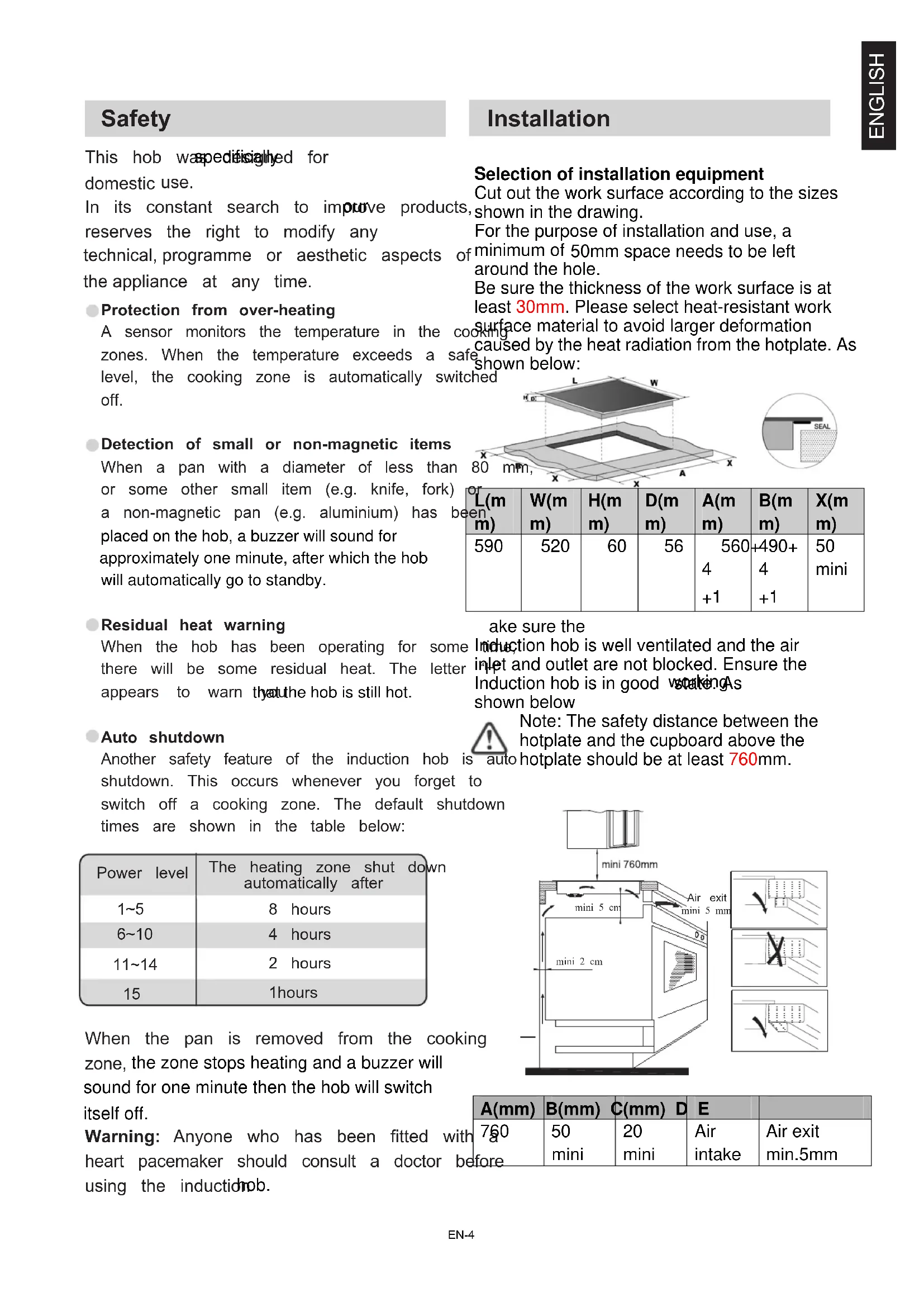 mini Air intake Air exit min.5mm specifically our 50mm space needs to be left placed on the hob, a buzzer will sound for approximately one minute, after which the hob will automatically go to standby. M ake sure the working that the hob is still hot. hob. the zone stops heating and a buzzer will sound for one minute then the hob will switch itself off. EN-4Before you install the hob, make sure that