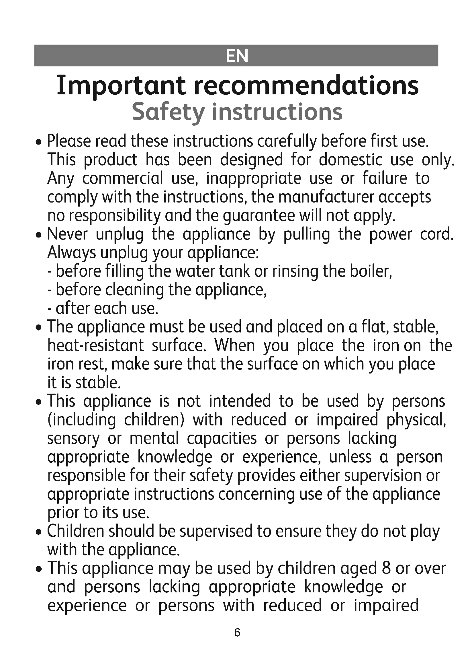 - The appliance must be used and placed on a flat, stable, heat-resistant surface. When you place the iron on the iron rest, make sure that the surface on which you place it is stable.