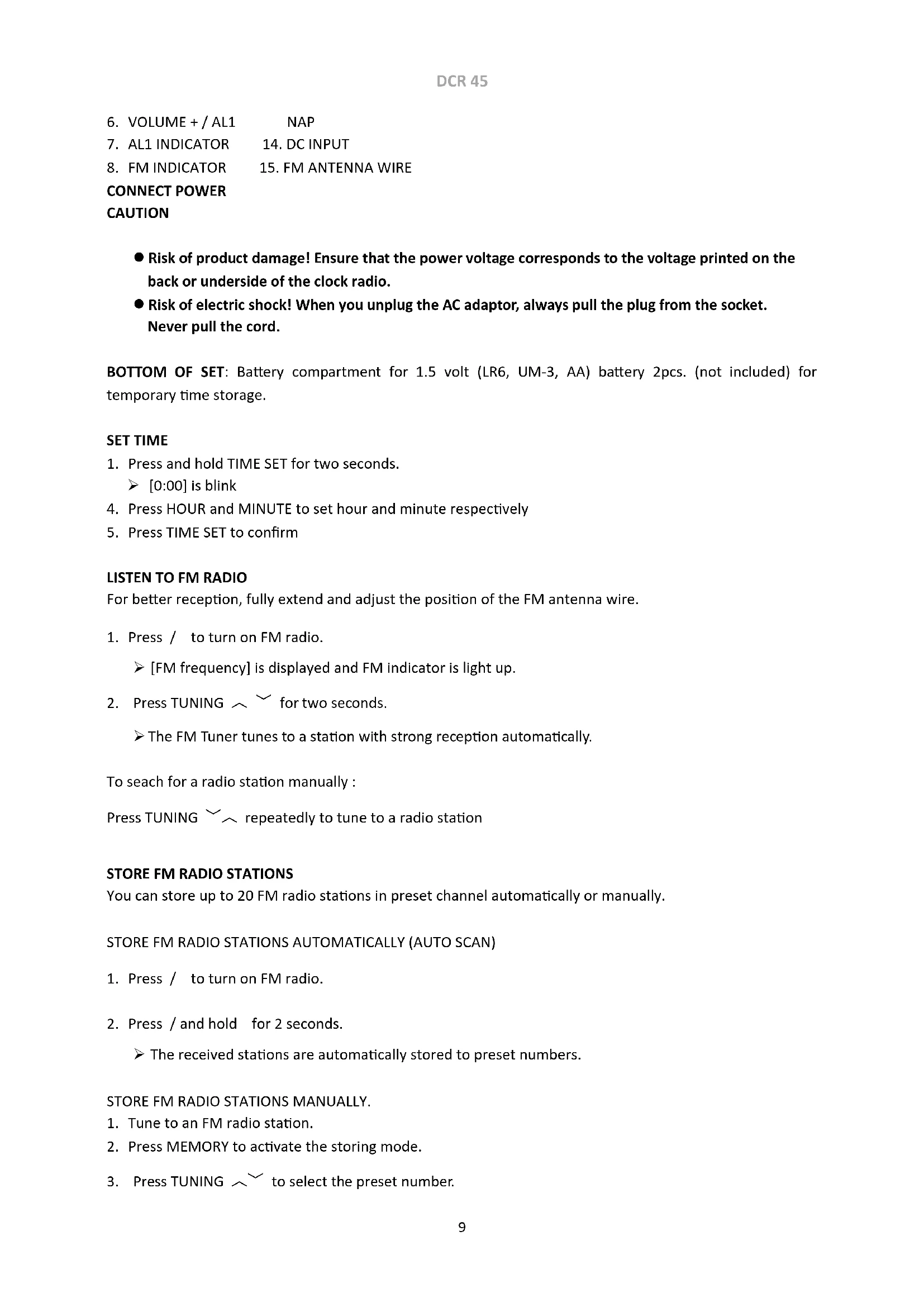 CONNECT POWER CAUTION Risk of product damage! Ensure that the power voltage corresponds to the voltage printed on the back or underside of the clock radio. Risk of electric shock! When you unplug the AC adaptor, always pull the plug from the socket. Never pull the cord. BOTTOM OF SET: Battery compartment for 1.5 volt (LR6, UM-3, AA) battery 2pcs. (not included) for temporary time storage. SET TIME