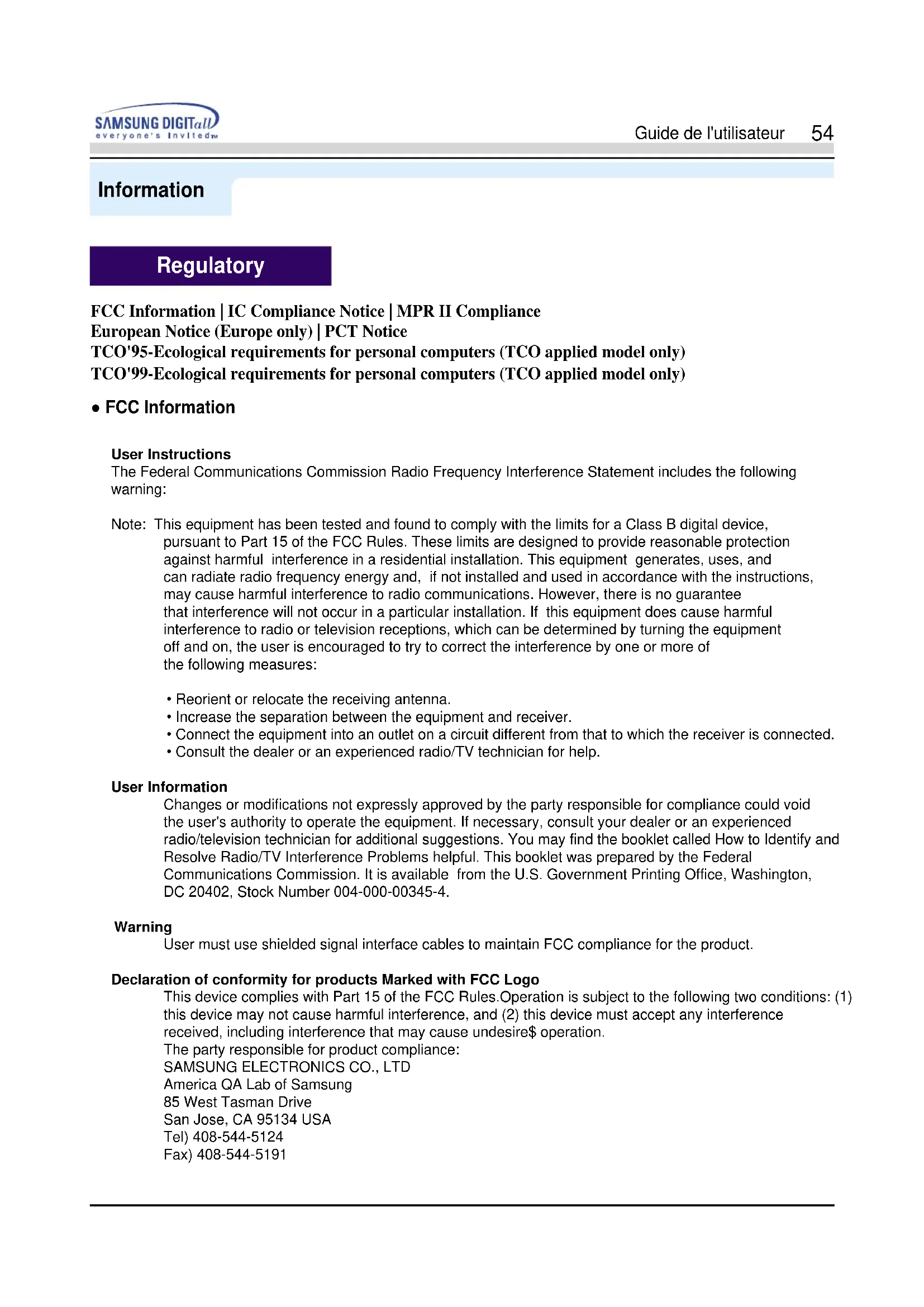 America QA Lab of Samsung 85 West Tasman Drive San Jose, CA 95134 USA Tel) 408-544-5124 Fax) 408-544-5191 RegulatoryInformation Guide de l'utilisateur ● IC Compliance Notice This Class B digital apparatus meets all requirements of the Canadian Interference-Causing Equipment Regulations of ICES-003. Cet appareil Numérique de classe B respecte toutes les exigences du Règlemont ICES-003 sur les équipements produisant des interférences au Canada. ● MPR II Compliance This monitor complies with SWEDAC(MPR II) recommendations for reduced electric and magnetic fields. ● European Notice (Europe only) ● PCT Notice Products with the CE Marking comply with both the EMC Directive (89/336/EEC), (92/31/EEC), (93/68/EEC) and the Low Voltage Directive (73/23/EEC) issued by the Commission of the European Community. Compliance with these directives implies conformity to the following European Norms: