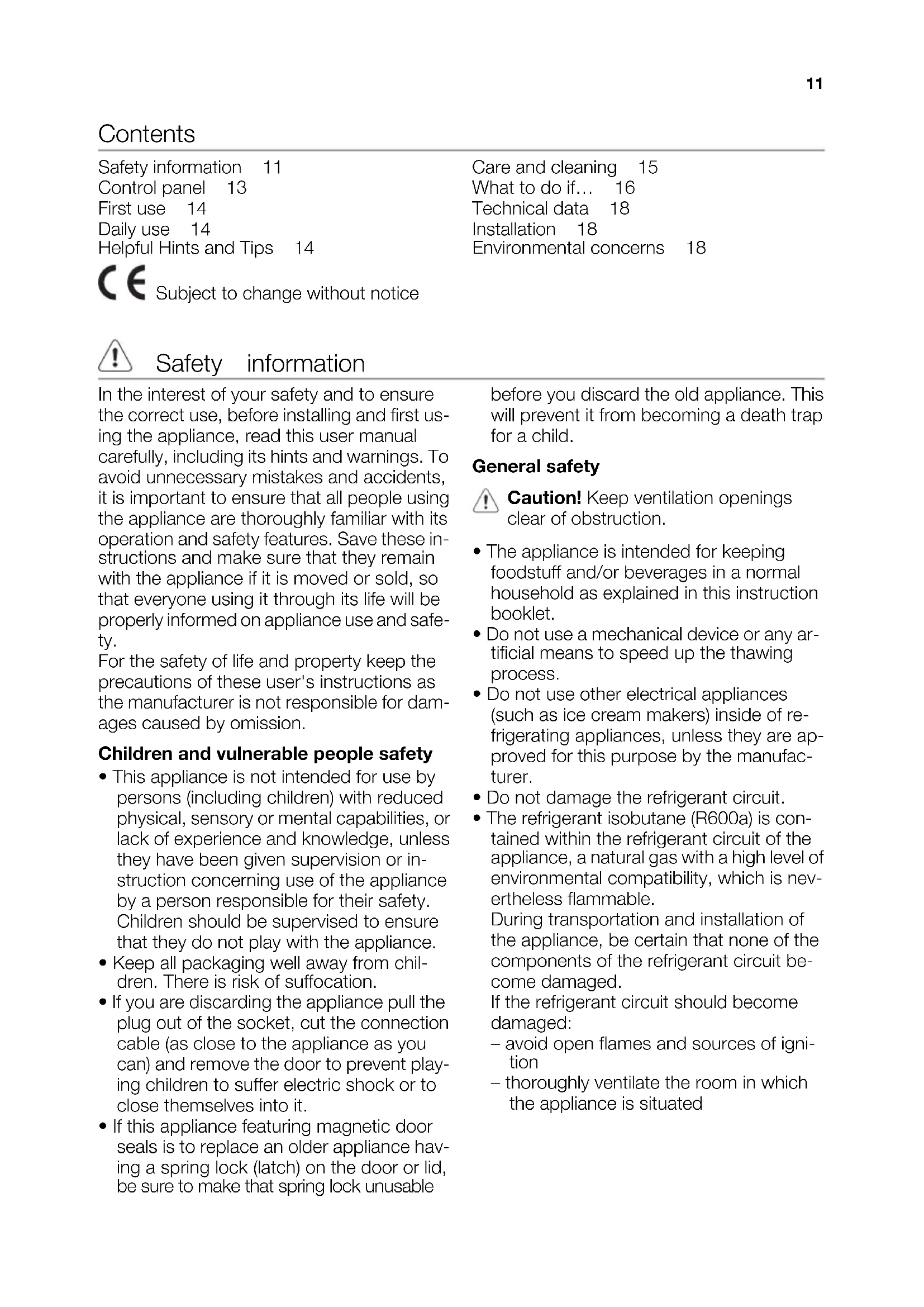 - If this appliance featuring magnetic door seals is to replace an older appliance hav- ing a spring lock (latch) on the door or lid, be sure to make that spring lock unusable before you discard the old appliance. This will prevent it from becoming a death trap for a child. General safety Caution! Keep ventilation openings clear of obstruction.