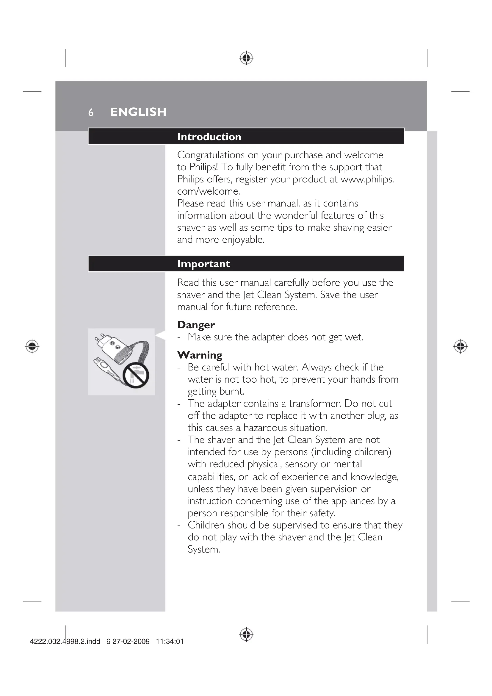4222.002.4998.2.indd 5 27-02-2009 11:34:006 Introduction Congratulations on your purchase and welcome to Philips! To fully benefit from the support that Philips offers, register your product at www.philips. com/welcome. Please read this user manual, as it contains information about the wonderful features of this shaver as well as some tips to make shaving easier and more enjoyable. Important Read this user manual carefully before you use the shaver and the Jet Clean System. Save the user manual for future reference. Danger Make sure the adapter does not get wet. Warning Be careful with hot water. Always check if the water is not too hot, to prevent your hands from getting burnt. The adapter contains a transformer. Do not cut off the adapter to replace it with another plug, as this causes a hazardous situation. The shaver and the Jet Clean System are not intended for use by persons (including children) with reduced physical, sensory or mental capabilities, or lack of experience and knowledge, unless they have been given supervision or instruction concerning use of the appliances by a person responsible for their safety. Children should be supervised to ensure that they do not play with the shaver and the Jet Clean System.