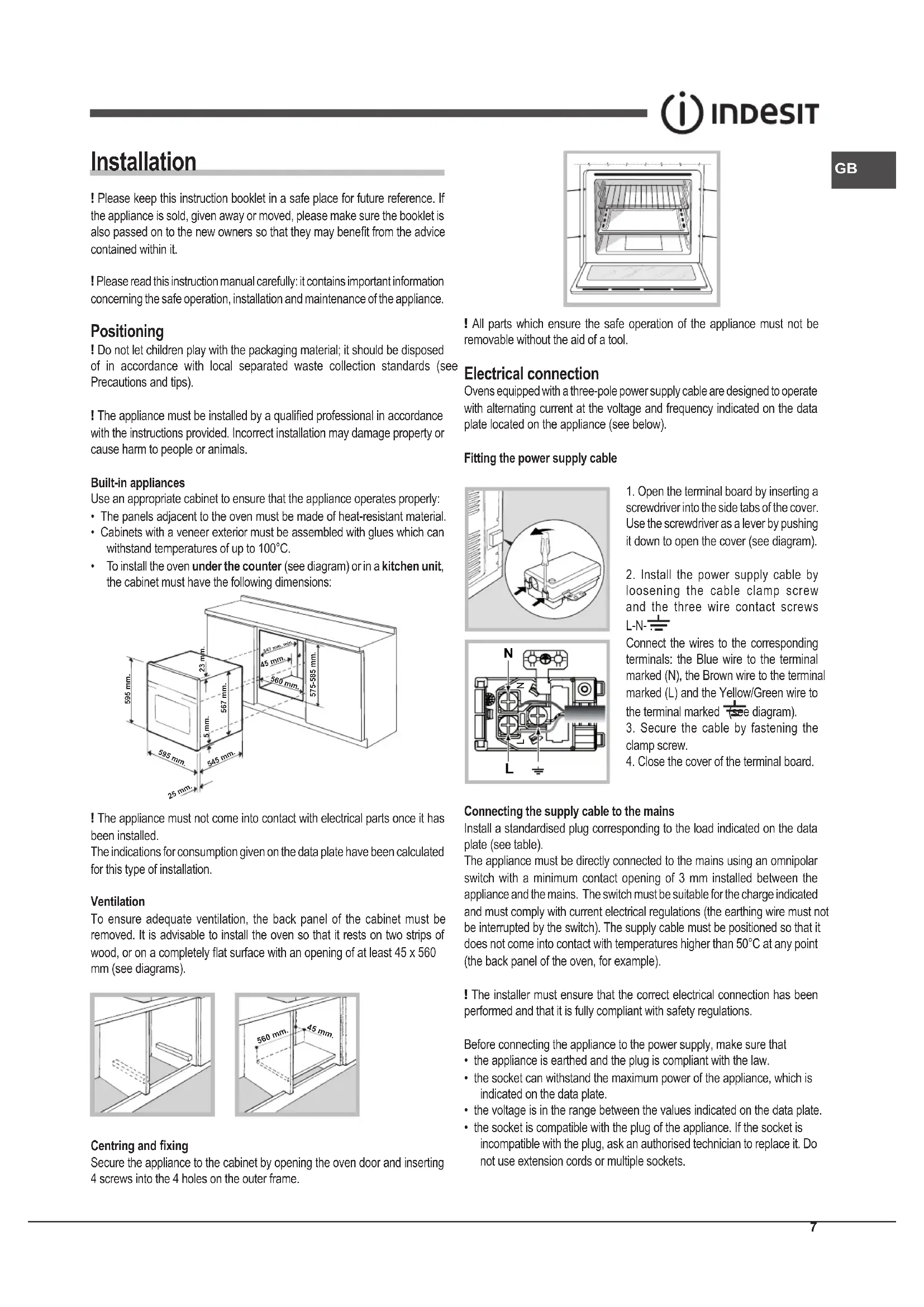- To install the oven under the counter (see diagram) or in a kitchen unit, the cabinet must have the following dimensions: 595 mm.595 mm.25 mm.545 mm.5 mm.567 mm.23 mm.575-585 mm.45 mm.560 mm. 547 mm. min. ! The appliance must not come into contact with electrical parts once it has been installed. The indications for consumption given on the data plate have been calculated for this type of installation. Ventilation To ensure adequate ventilation, the back panel of the cabinet must be removed. It is advisable to install the oven so that it rests on two strips of wood, or on a completely at surface with an opening of at least 45 x 560 mm (see diagrams). 560 mm. 45 mm. Centring and xing Secure the appliance to the cabinet by opening the oven door and inserting 4 screws into the 4 holes on the outer frame. ! All parts which ensure the safe operation of the appliance must not be removable without the aid of a tool. Electrical connection Ovens equipped with a three-pole power supply cable are designed to operate with alternating current at the voltage and frequency indicated on the data plate located on the appliance (see below). Fitting the power supply cable