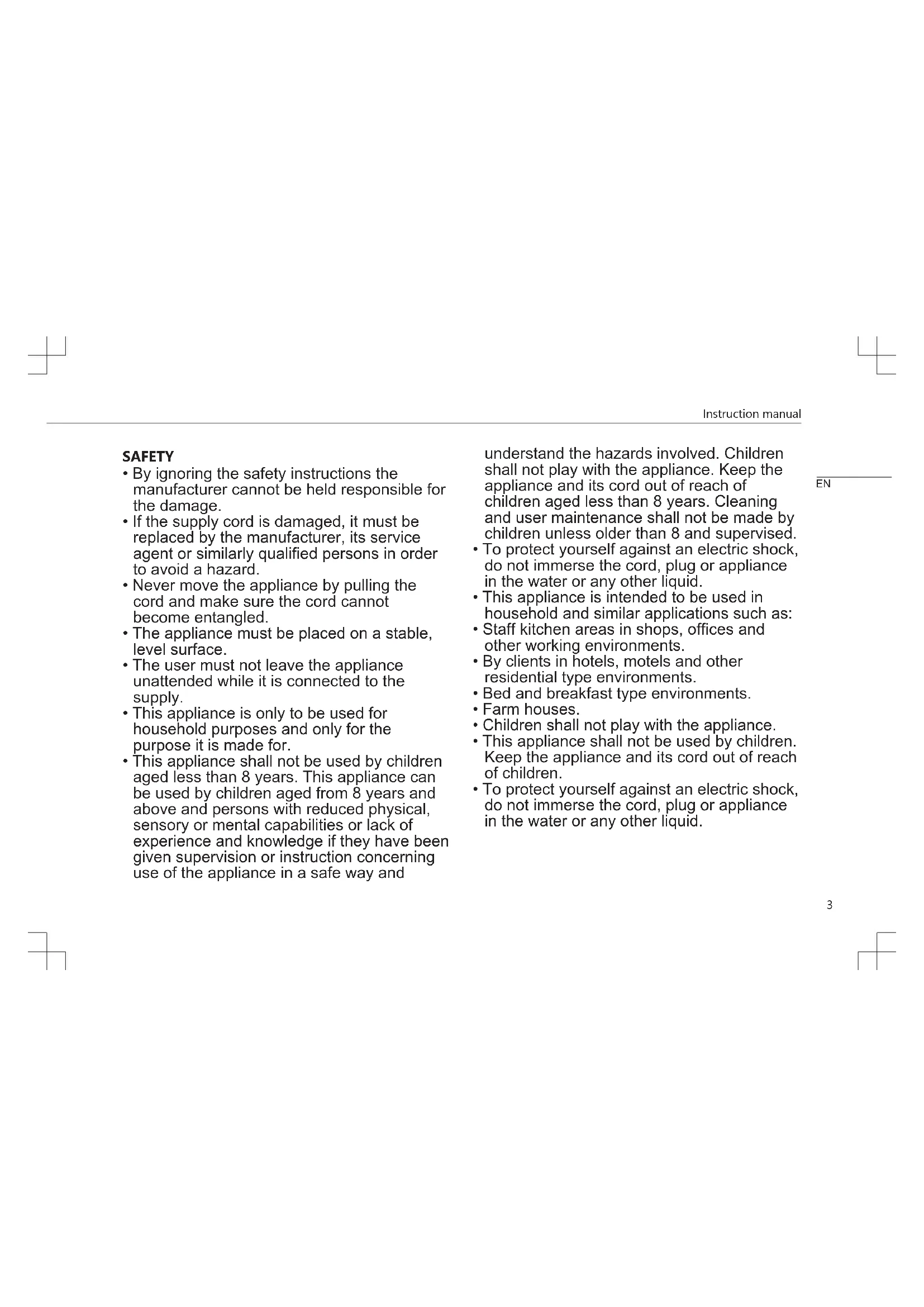 - To protect yourself against an electric shock, do not immerse the cord, plug or appliance in the water or any other liquid. ENInstruction manual