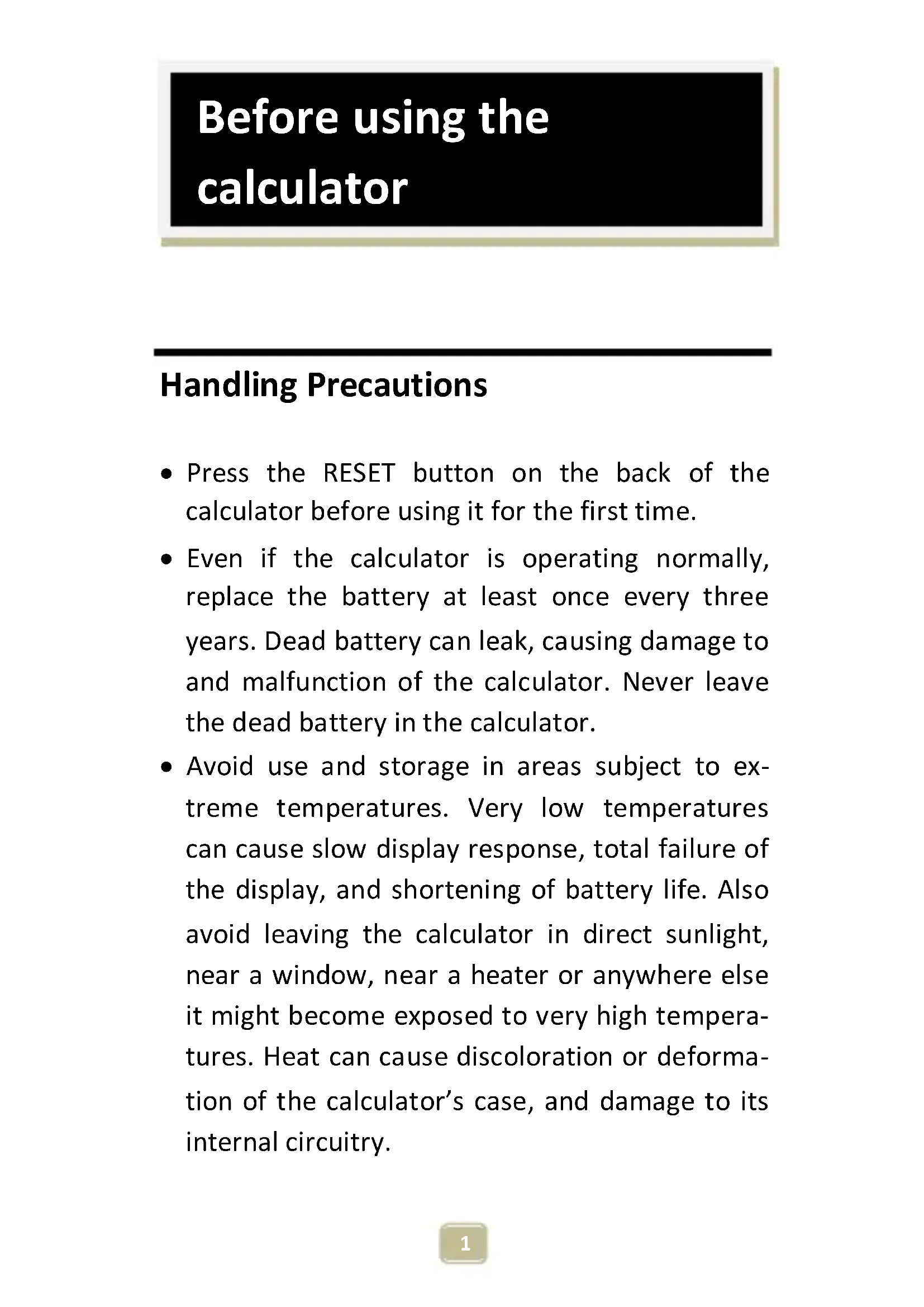 - Avoid use and storage in areas subject to humidity or dust. Never to leave the calculator where it might be splashed by water or exposed to large humidity or dust. These adverse condi- tions may damage its internal circuitry.