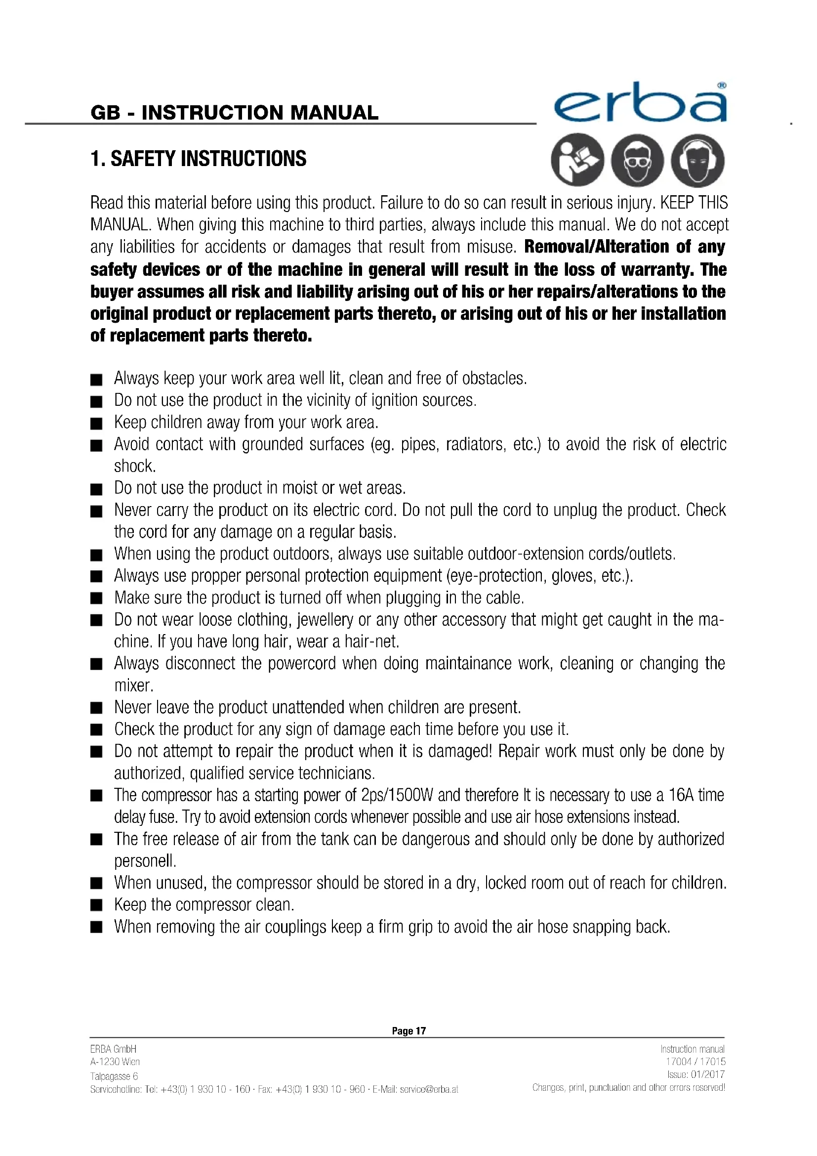 Download the instructions for your Compressor in PDF format for free! Find your manual 17015 - Erba and take your electronic device back in hand. On this page are published all the documents necessary for the use of your device. 17015 by Erba.