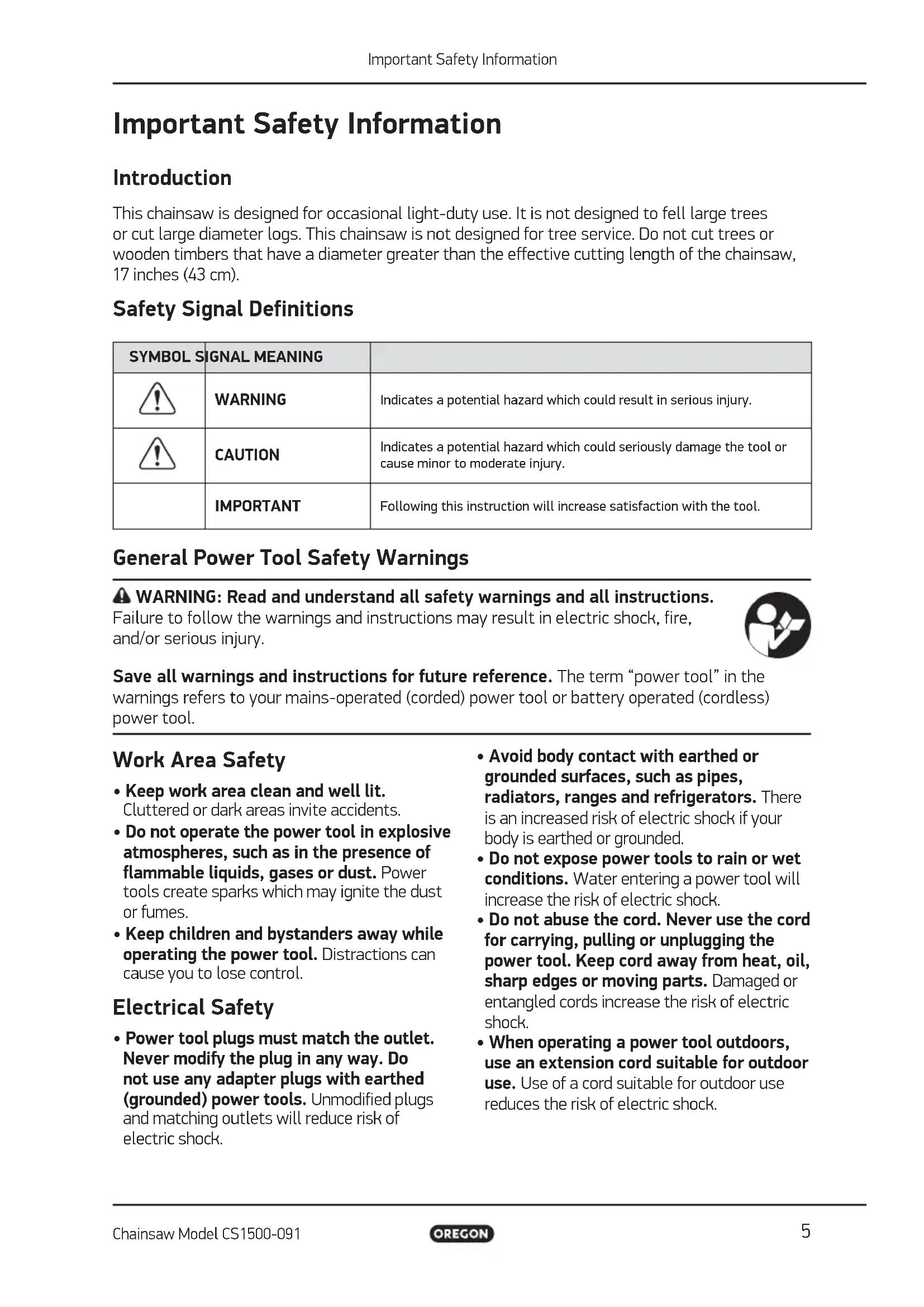 - When operating a power tool outdoors, use an extension cord suitable for outdoor use. Use of a cord suitable for outdoor use reduces the risk of electric shock.6 Important Safety Information Chainsaw Model CS1500-091