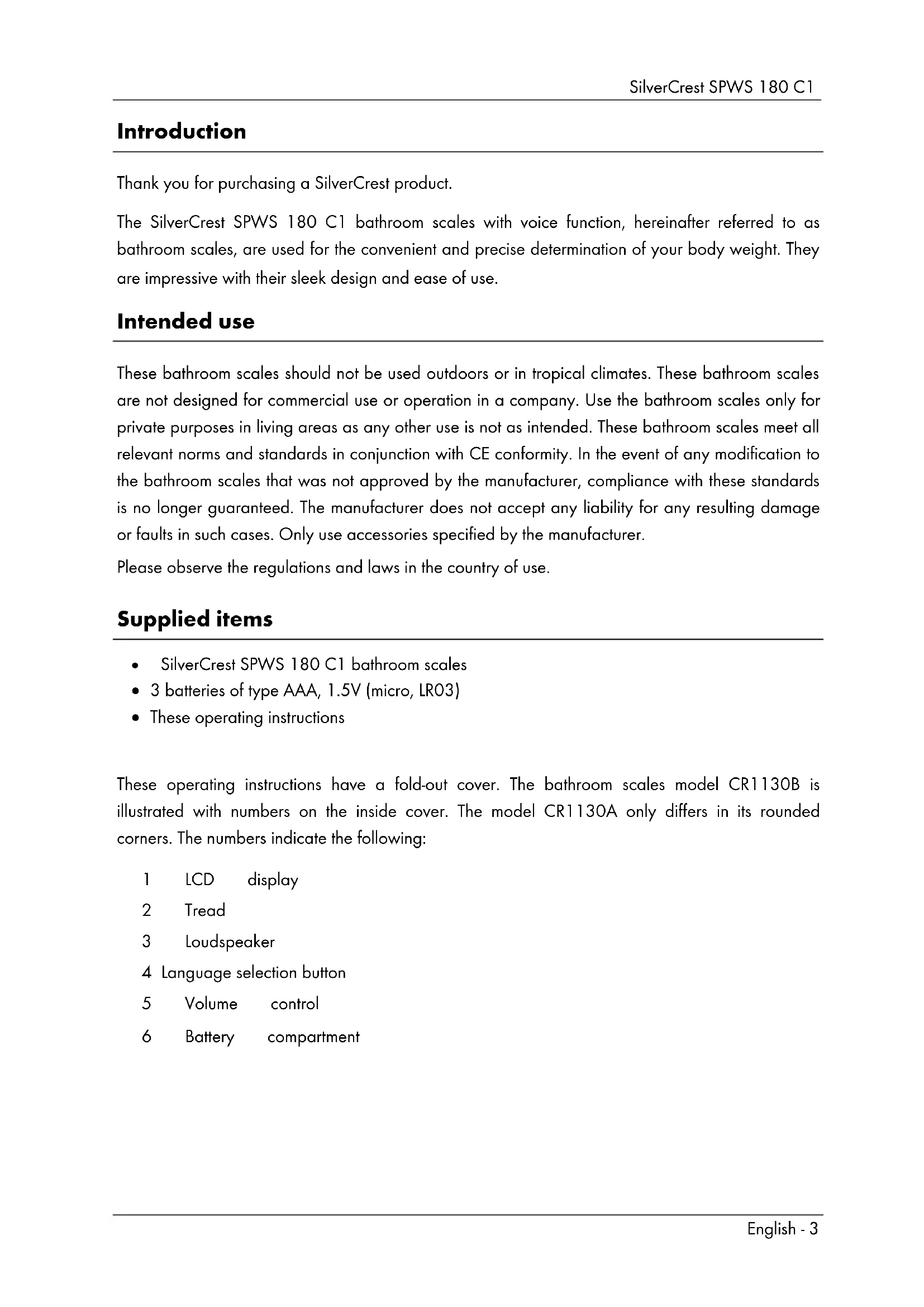 Copyright All information contained in these instructions is subject to copyright and is provided for information purposes only. It is only permitted to copy or duplicate data and information with the express and written consent of the author. This also includes commercial use of the content and data. The text and illustrations are based on the state of the art at the time of printing. Subject to change. Prior to use Inserting the batteries To insert the batteries, open the cover of the battery compartment at the rear of the bathroom scales by slipping your finger into the slot on the side of the battery compartment (6). Now remove the cover of the battery compartment (6) and insert the supplied batteries. Pay attention to the polarity (note + and -) when inserting the batteries. The polarity is illustrated on the batteries and in the battery compartment (6). Then replace the cover on the battery compartment (6) until it snaps into place. The bathroom scales are now ready to use.SilverCrest SPWS 180 C1 English - 7 First use Switching on the bathroom scales / measuring weight Due to the step on power function, the bathroom scales are switched on automatically when you step on the tread (2) and they start to measure your weight immediately. A solid surface is required to measure weight correctly. Thus always place the bathroom scales on a solid, horizontal floor covering and never on carpet. This can distort the measurement result. To obtain comparable measurement results, you should always weigh yourself if possible at the same time of day (preferably in the morning). Always weigh yourself if possible under the same conditions: on an empty stomach, after having gone to the toilet and naked. The unit of weight is set to "kg". To change the language, press the language selection button (4) when the scales are switched on. The selected language is then indicated on the LCD display (1). The following languages are supported by the bathroom scales: Display Language FI Finnish SE Swedish DK Danish FR French NL Dutch Set the desired volume for the voice output via the volume control (5) In order to deactivate the voice output, turn the volume control (5) completely towards "-" until it snaps into place. Stand on the tread (2) of the bathroom scales so that your weight is evenly distributed. Remain as still as possible during the weighing process as the measurement result may be distorted otherwise. The measurement result is indicated on the LCD display (1) during the weighing process. The measurement is complete when the display flashes twice. The determined weight is also indicated via the voice output. In order to perform another measurement, you have to step off the tread (2) of the bathroom scales. Then wait until the LCD display (1) resets itself or the voice output confirms the operational readiness before stepping on the tread (2) again.SilverCrest SPWS 180 C1