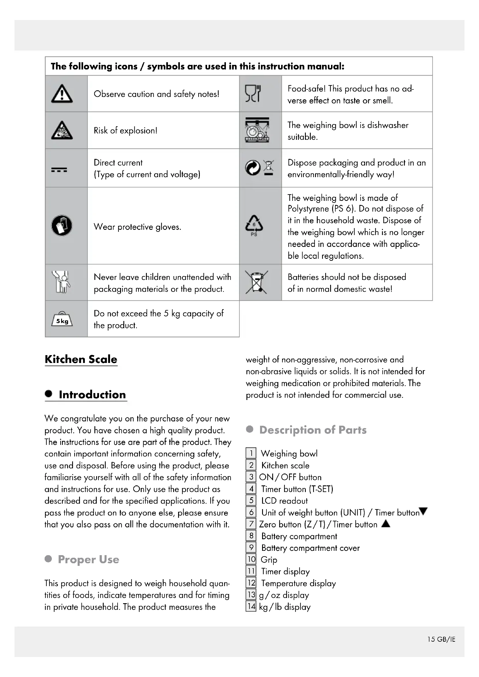 INJURY! Do not exceed the 5 kg capacity of the product. This could damage the product. Do not expose the product to - extreme temperatures, - strong vibrations, - heavy mechanical loads, - direct sunlight - magnetic fields, - moisture. These can damage the product. Protect the product from electro- static charge / discharge. This could hinder the internal data exchange, which causes errors in the LCD readout.17 GB/IE Check the product for damage before use. Never use a dam- aged product. Never open the housing of the product. This can result in injury and damage to the product. Repairs must be car- ried out by an electrician only. Do not allow anyone inexperi- enced to use the product. Make sure that anyone intending to use the product has read the operat- ing manual and is capable of operating the product safely. Place the product on a solid, horizontal and flat surface. Normal functioning of the product may be disturbed by electromag- netic interference. In this case, briefly remove the battery from the product and insert it again. Do this as described in the “Replacing battery“ chapter. FOOD-SAFE! This product has no adverse effect on taste or smell. The weighing bowl is dishwasher suitable. Battery Safety Instructions DANGER TO LIFE! Keep batteries out of the reach of children. Do not leave batteries lying around. There is a risk of children or animals swal- lowing them. Consult a doctor immediately if a battery is swal- lowed. EXPLOSION HAZ- ARD! Never recharge, short-circuit and / or open batter- ies. This can cause them to over- heat, burn or burst. Never throw batteries into fire or water. The batteries may explode. Avoid extreme conditions and temperatures which can affect batteries, e. g. heaters. Otherwise there is an increased risk of leakage. Remove a spent battery from the product immediately. Otherwise there is an increased risk of leakage. Check regularly that the battery is not leaking. Leaked or damaged bat- teries can cause chemical burns if they come into contact with the skin; in such cases you must wear suitable protective gloves. Avoid contact with the skin, eyes and mucous membranes if fluid has leaked from the battery. In the event of contact with battery18 GB/IE acid, rinse the affected area with plenty of clean water and consult a doctor immediately. Remove light dirt from the battery and product contacts with a dry, non-fluffing cloth before inserting the battery. Remove the battery from the product if it is not in use for any length of time. Make sure that the polarity is correct when you insert the bat- tery . This is indicated in the bat- tery compartment. The battery can otherwise explode. Insert the battery with care. The product can otherwise be damaged. Please do not dispose of used batteries in your household waste but take them to a designated collection depot for special waste.