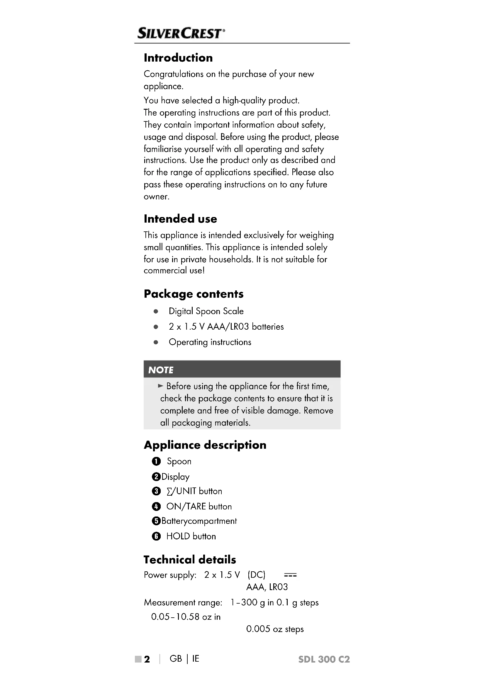 Introduction Congratulations on the purchase of your new appliance. You have selected a high-quality product. The operating instructions are part of this product. They contain important information about safety, usage and disposal. Before using the product, please familiarise yourself with all operating and safety instructions. Use the product only as described and for the range of applications specified. Please also pass these operating instructions on to any future owner. Intended use This appliance is intended exclusively for weighing small quantities. This appliance is intended solely for use in private households. It is not suitable for commercial use! Package contents ● Digital Spoon Scale ● 2 x 1.5 V AAA/LR03 batteries ● Operating instructions NOTE ► Before using the appliance for the first time, check the package contents to ensure that it is complete and free of visible damage. Remove all packaging materials. Appliance description 1 Spoon 2 Display