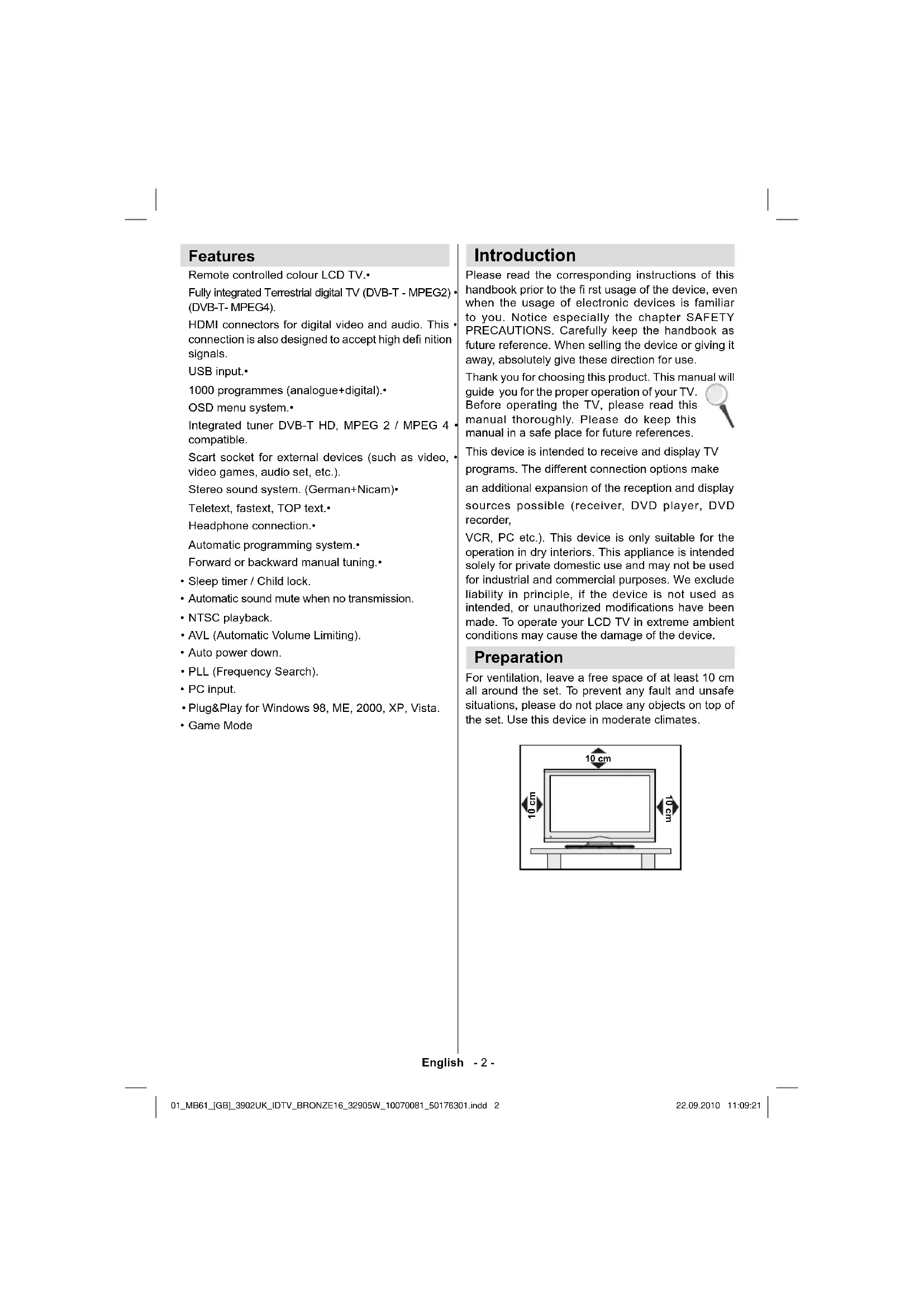 - Digital Reception (DVB-T) 01_MB61_[GB]_3902UK_IDTV_BRONZE16_32905W_10070081_50176301.indd 101_MB61_[GB]_3902UK_IDTV_BRONZE16_32905W_10070081_50176301.indd 1 22.09.2010 11:09:2122.09.2010 11:09:21English - 2 - Features Remote controlled colour LCD TV.• Fully integrated Terrestrial digital TV (DVB-T - MPEG2) • (DVB-T- MPEG4). HDMI connectors for digital video and audio. This • connection is also designed to accept high defi nition signals. USB input.• 1000 programmes (analogue+digital).• OSD menu system.• Integrated tuner DVB-T HD, MPEG 2 / MPEG 4 • compatible. Scart socket for external devices (such as video, • video games, audio set, etc.). Stereo sound system. (German+Nicam)• Teletext, fastext, TOP text.• Headphone connection.• Automatic programming system.• Forward or backward manual tuning.• Sleep timer / Child lock.• Automatic sound mute when no transmission.• NTSC playback. • AVL (Automatic Volume Limiting).• Auto power down.• PLL (Frequency Search).• PC input. • Plug&Play for Windows 98, ME, 2000, XP, Vista.• Game Mode • Introduction Please read the corresponding instructions of this handbook prior to the fi rst usage of the device, even when the usage of electronic devices is familiar to you. Notice especially the chapter SAFETY PRECAUTIONS. Carefully keep the handbook as future reference. When selling the device or giving it away, absolutely give these direction for use. Thank you for choosing this product. This manual will guide you for the proper operation of your TV. Before operating the TV, please read this manual thoroughly. Please do keep this manual in a safe place for future references. This device is intended to receive and display TV programs. The different connection options make an additional expansion of the reception and display sources possible (receiver, DVD player, DVD recorder, VCR, PC etc.). This device is only suitable for the operation in dry interiors. This appliance is intended solely for private domestic use and may not be used for industrial and commercial purposes. We exclude liability in principle, if the device is not used as intended, or unauthorized modifi cations have been made. To operate your LCD TV in extreme ambient conditions may cause the damage of the device. Preparation For ventilation, leave a free space of at least 10 cm all around the set. To prevent any fault and unsafe situations, please do not place any objects on top of the set. Use this device in moderate climates. 10 cm 10 cm 10 cm 01_MB61_[GB]_3902UK_IDTV_BRONZE16_32905W_10070081_50176301.indd 201_MB61_[GB]_3902UK_IDTV_BRONZE16_32905W_10070081_50176301.indd 2 22.09.2010 11:09:2122.09.2010 11:09:21English - 3 - Safety Precautions Read the following recommended safety precautions carefully for your safety. Power Source The TV set should be operated only from a 220-240 V AC, 50 Hz outlet. Ensure that you select the correct voltage setting for your convenience. Power Cord Do not place the set, a piece of furniture, etc. on the power cord (mains lead) or pinch the cord. The connection plug should be readily accessible to the power cord and mains. Handle the power cord by the plug. Do not unplug the appliance by pulling from the power cord and never touch the power cord with wet hands as this could cause a short circuit or electric shock. Never make a knot in the cord or tie it with other cords. The power cords should be placed in such a way that they are not likely to be stepped on. A damaged power cord can cause fi re or give you an electric shock. When it is damaged and needs to be replaced, it should be done by qualifi ed personnel. Moisture and Water Do not use this device in a humid and damp place (avoid the bathroom, the sink in the kitchen, and near the washing machine). Do not expose this device to rain or water, as this may be dangerous and do not place objects filled with liquids, such as fl ower vases, on top. Avoid from dripping or splashing. If any solid object or liquid falls into the cabinet, unplug the TV and have it checked by qualifi ed personnel before operating it any further. Cleaning Before cleaning, unplug the TV set from the wall outlet. Do not use liquid or aerosol cleaners. Use soft and dry cloth. Ventilation The slots and openings on the TV set are intended for ventilation and to ensure reliable operation. To prevent overheating, these openings must not be blocked or covered in anyway. Heat and Flames The set should not be placed near to open fl ames and sources of intense heat such as an electric heater. Ensure that no open fl ame sources, such as lighted candles, are placed on top of the TV. Batteries should not be exposed to excessive heat such as sunshine, fi re or the like. Lightning In case of storm and lightning or when going on holiday, disconnect the power cord from the wall outlet. Replacement Parts When replacement parts are required, make sure that the service technician has used replacement parts, which are specifi ed by the manufacturer or have the same specifi cations as the original one. Unauthorized substitutions may result in fi re, electrical shock or other hazards. Servicing Please refer all servicing to qualifi ed personnel. Do not remove the cover yourself as this may result in an electric shock. Waste Disposal Instructions for waste disposal:• Packaging and packaging aids are recyclable and should principally be recycled. Packaging materials, such as foil bag, must be kept away from children. Batteries, including those which are heavy metal-free, should not be disposed of with household waste. Please dispose of used battery in an environment friendly manner. Find out about the legal regulations which apply in your area. p. 30