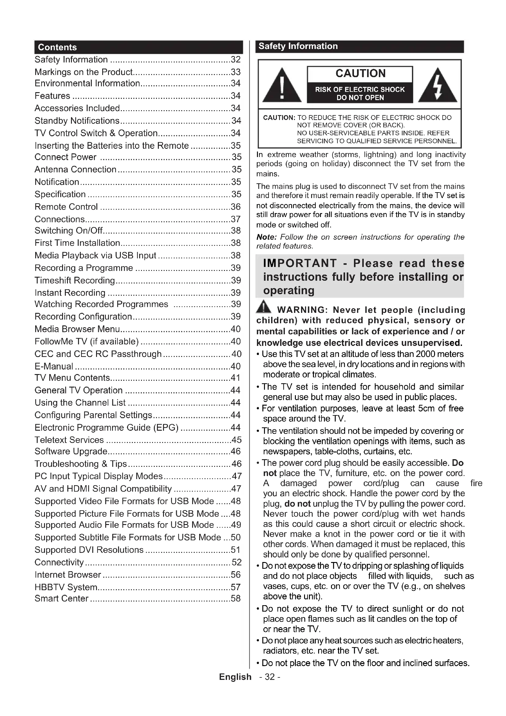 - DonotplacetheTVontheoorandinclinedsurfaces. Contents Safety Information ................................................32 Markings on the Product.......................................33 Environmental Information....................................34 Features ...............................................................34 Accessories Included............................................34 StandbyNotications ............................................34 TV Control Switch & Operation.............................34 Inserting the Batteries into the Remote ................35 Connect Power .................................................... 35 Antenna Connection ............................................. 35 Notication ............................................................ 35 Specication .........................................................35 Remote Control ....................................................36 Connections..........................................................37 Switching On/Off ...................................................38 First Time Installation............................................38 Media Playback via USB Input .............................38 Recording a Programme ......................................39 Timeshift Recording ..............................................39 Instant Recording .................................................39 Watching Recorded Programmes .......................39 RecordingConguration .......................................39 Media Browser Menu............................................40 FollowMe TV (if available) ....................................40 CEC and CEC RC Passthrough ........................... 40 E-Manual ..............................................................40 TV Menu Contents................................................41 General TV Operation ..........................................44 Using the Channel List .........................................44 ConguringParentalSettings ...............................44 Electronic Programme Guide (EPG) ....................44 Teletext Services ..................................................45 Software Upgrade.................................................46 Troubleshooting & Tips ......................................... 46 PC Input Typical Display Modes ........................... 47 AV and HDMI Signal Compatibility .......................47 Supported Video File Formats for USB Mode ......48 Supported Picture File Formats for USB Mode ....48 Supported Audio File Formats for USB Mode ......49 Supported Subtitle File Formats for USB Mode ...50 Supported DVI Resolutions ..................................51 Connectivity .......................................................... 52 Internet Browser ...................................................56 HBBTV System.....................................................57 Smart Center ........................................................58English - 33 -