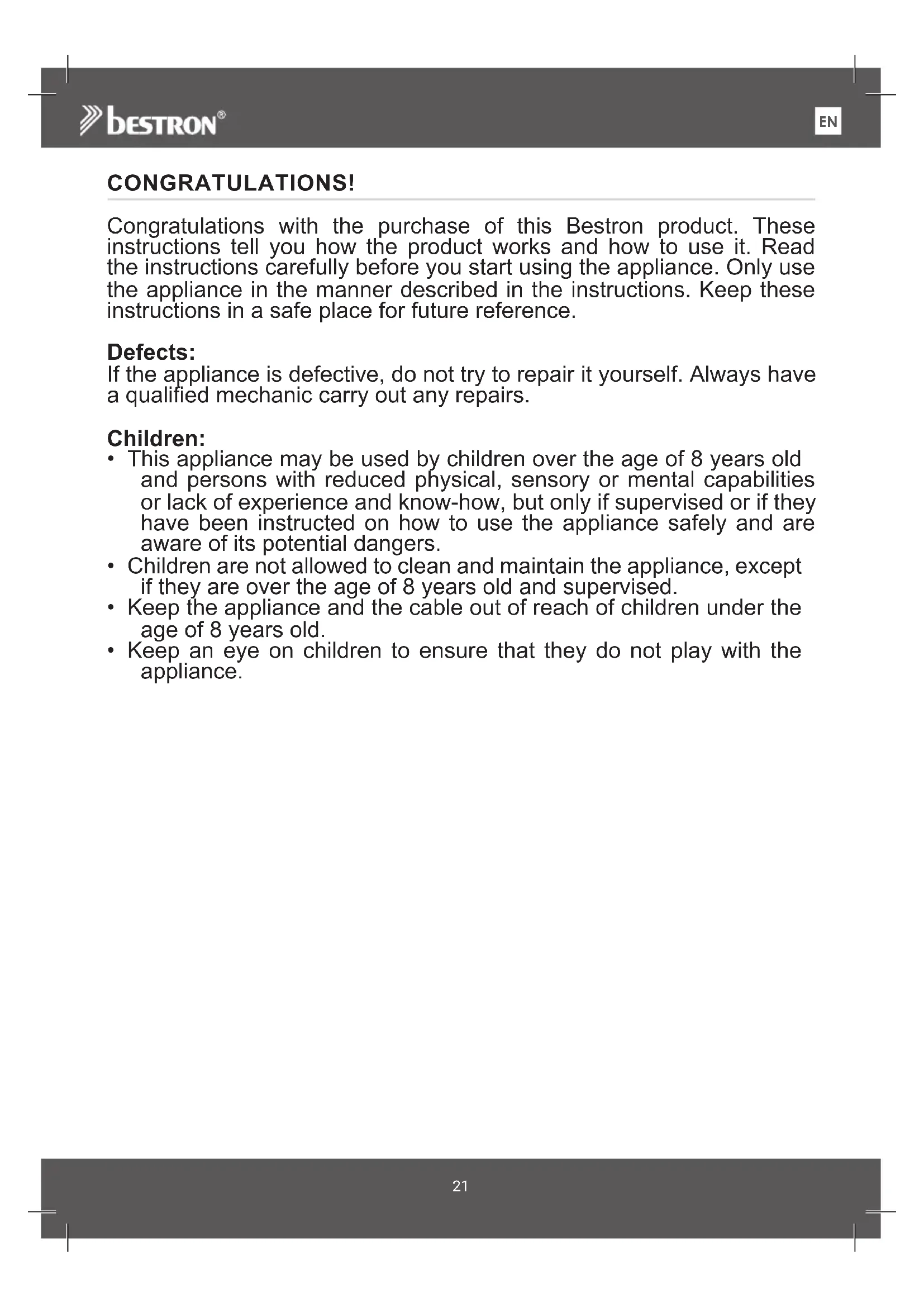 NLCONGRATULATIONS! Congratulations with the purchase of this Bestron product. These instructions tell you how the product works and how to use it. Read the instructions carefully before you start using the appliance. Only use the appliance in the manner described in the instructions. Keep these instructions in a safe place for future reference. Defects: If the appliance is defective, do not try to repair it yourself. Always have a qualified mechanic carry out any repairs. Children: