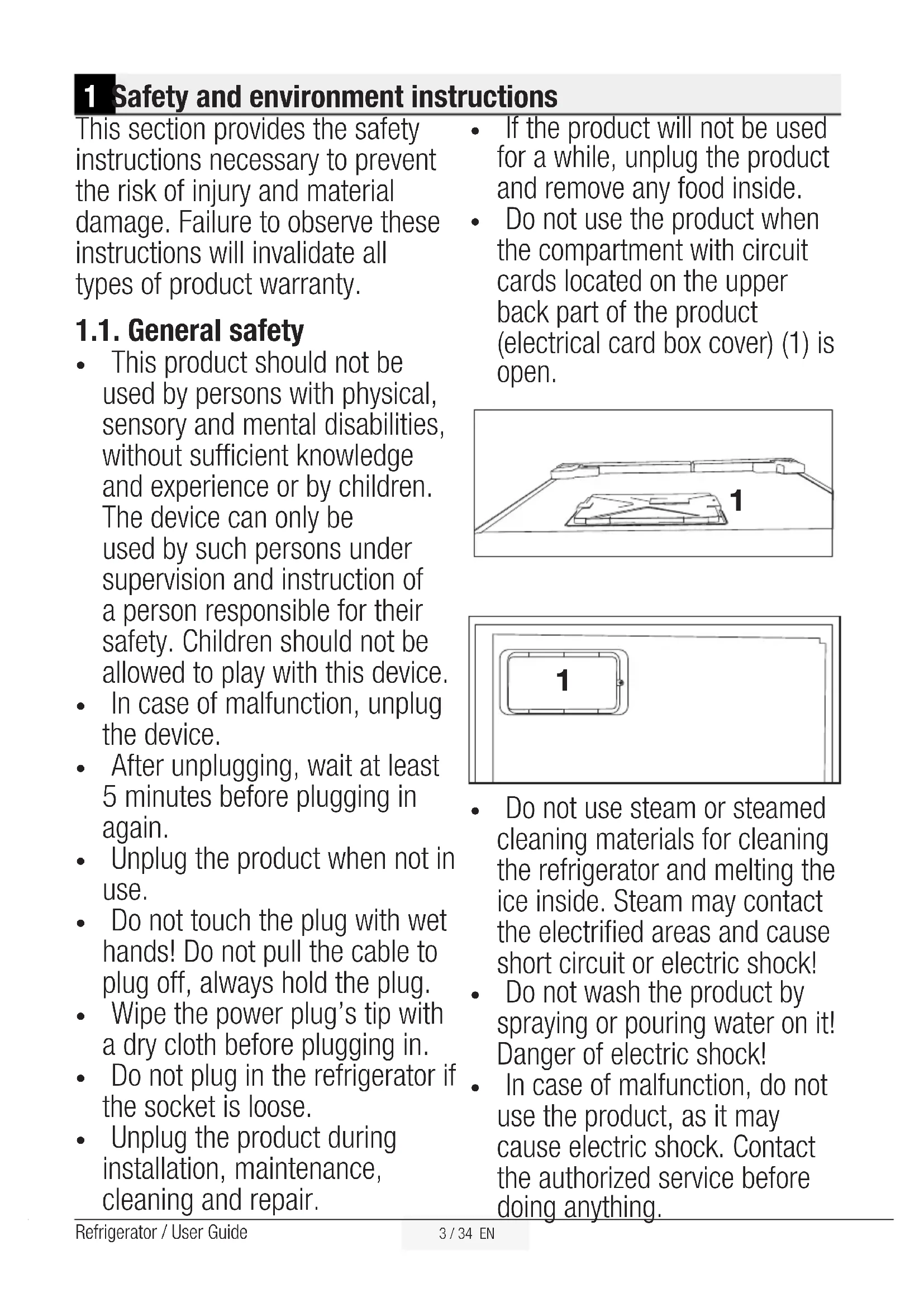 Risk of electric shock. The product’s packaging is made of recyclable materials, in accordan- ce with the National Environment Legislation.2 / 34 EN Refrigerator / User Guide 1 Safety and environment instructions 3 1.1. General safety. . . . . . . . . . . . . . . . . . . . . . . 3