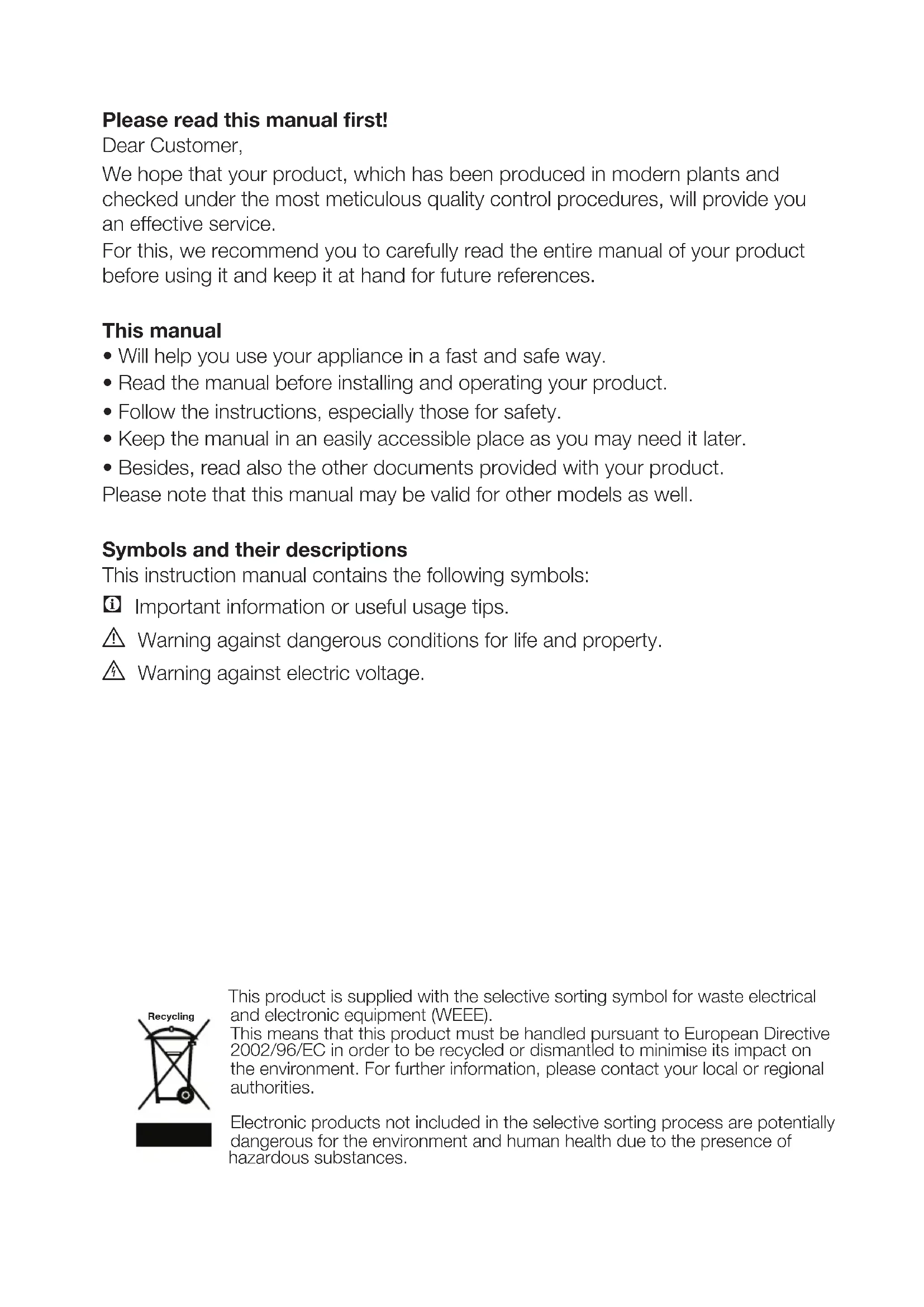 - Besides, read also the other documents provided with your product. Please note that this manual may be valid for other models as well. Symbols and their descriptions This instruction manual contains the following symbols: C Important information or useful usage tips. A Warning against dangerous conditions for life and property. B Warning against electric voltage. This product is supplied with the selective sorting symbol for waste electrical and electronic equipment (WEEE). This means that this product must be handled pursuant to European Directive 2002/96/EC in order to be recycled or dismantled to minimise its impact on the environment. For further information, please contact your local or regional authorities. Electronic products not included in the selective sorting process are potentially dangerous for the environment and human health due to the presence of hazardous substances. RecyclingEN