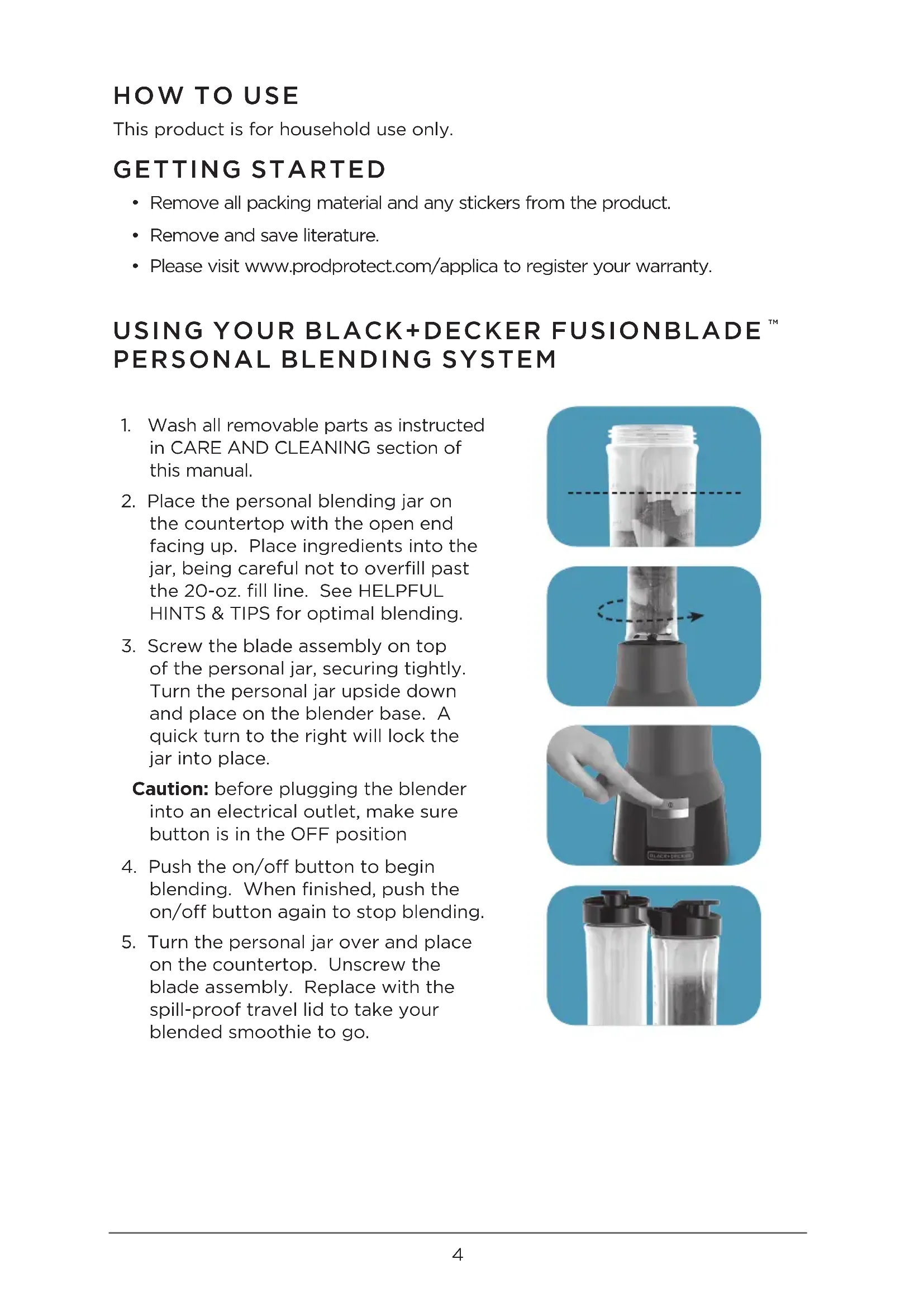 of the personal jar, securing tightly. Turn the personal jar upside down and place on the blender base. A quick turn to the right will lock the jar into place. Caution: before plugging the blender into an electrical outlet, make sure button is in the OFF position