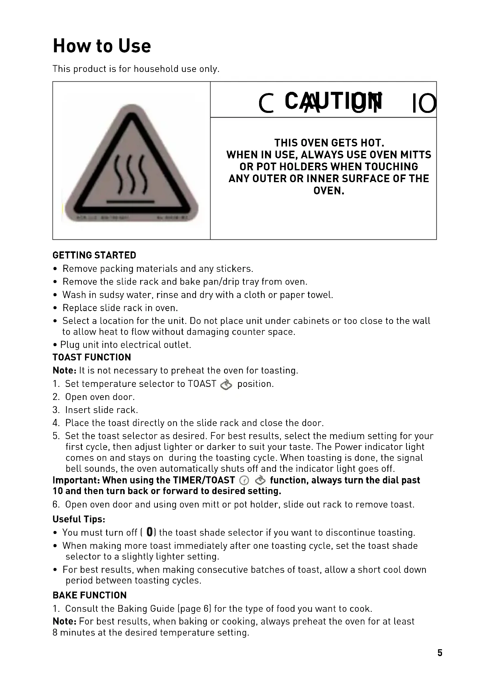 Important: When using the TIMER/ TOAST function, always turn the dial past 10 and then turn back or forward to desired setting.5 How to Use This product is for household use only.GETTING STARTED• Remove packing materials and any stickers.• Remove the slide rack and bake pan/drip tray from oven.• Wash in sudsy water, rinse and dry with a cloth or paper towel. • Replace slide rack in oven.• Select a location for the unit. Do not place unit under cabinets or too close to the wall to allow heat to flow without damaging counter space. • Plug unit into electrical outlet.TOAST FUNCTIONNote: It is not necessary to preheat the oven for toasting.1. Set temperature selector to TOAST position.2. Open oven door. 3. Insert slide rack.4. Place the toast directly on the slide rack and close the door.5. Set the toast selector as desired. For best results, select the medium setting for your first cycle, then adjust lighter or darker to suit your taste. The Power indicator light comes on and stays on during the toasting cycle. When toasting is done, the signal bell sounds, the oven automatically shuts off and the indicator light goes off.Important: When using the TIMER/TOAST function, always turn the dial past 10 and then turn back or forward to desired setting.6. Open oven door and using oven mitt or pot holder, slide out rack to remove toast.Useful Tips:• You must turn off () the toast shade selector if you want to discontinue toasting.• When making more toast immediately after one toasting cycle, set the toast shade selector to a slightly lighter setting.• For best results, when making consecutive batches of toast, allow a short cool down period between toasting cycles.BAKE FUNCTION1. Consult the Baking Guide (page 6) for the type of food you want to cook.Note: For best results, when baking or cooking, always preheat the oven for at least 8 minutes at the desired temperature setting. C A UT IO N