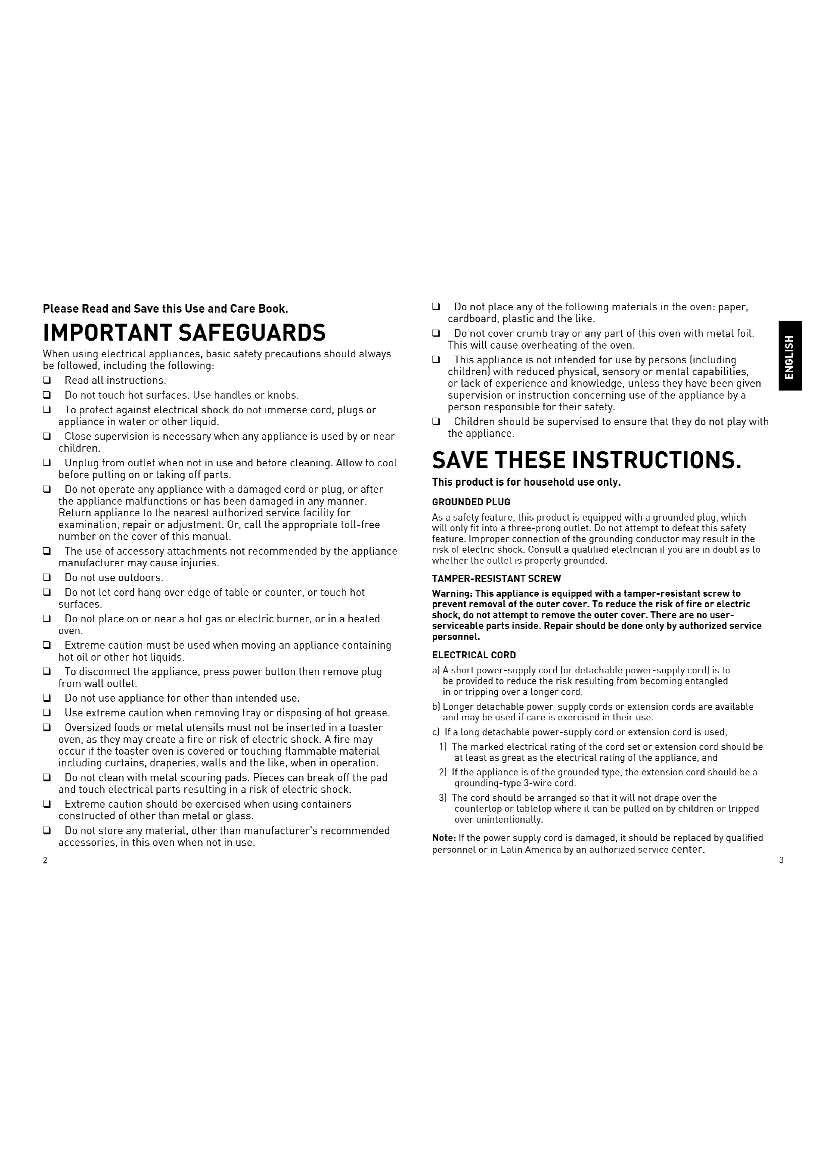 Please Read and Save this Use and Care Book. IMPORTANT SAFEGUARDS When using electrical appliances, basic safety precautions should always be followed, including the following: ❑ Read all instructions. ❑ Do not touch hot surfaces. Use handles or knobs. ❑ To protect against electrical shock do not immerse cord, plugs or appliance in water or other liquid. ❑ Close supervision is necessary when any appliance is used by or near children. ❑ Unplug from outlet when not in use and before cleaning. Allow to cool before putting on or taking off parts. ❑ Do not operate any appliance with a damaged cord or plug, or after the appliance malfunctions or has been damaged in any manner. Return appliance to the nearest authorized service facility for examination, repair or adjustment. Or, call the appropriate toll-free number on the cover of this manual. ❑ The use of accessory attachments not recommended by the appliance manufacturer may cause injuries. ❑ Do not use outdoors. ❑ Do not let cord hang over edge of table or counter, or touch hot surfaces. ❑ Do not place on or near a hot gas or electric burner, or in a heated oven. ❑ Extreme caution must be used when moving an appliance containing hot oil or other hot liquids. ❑ To disconnect the appliance, press power button then remove plug from wall outlet. ❑ Do not use appliance for other than intended use. ❑ Use extreme caution when removing tray or disposing of hot grease. ❑ Oversized foods or metal utensils must not be inserted in a toaster oven, as they may create a fire or risk of electric shock. A fire may occur if the toaster oven is covered or touching flammable material including curtains, draperies, walls and the like, when in operation. ❑ Do not clean with metal scouring pads. Pieces can break off the pad and touch electrical parts resulting in a risk of electric shock. ❑ Extreme caution should be exercised when using containers constructed of other than metal or glass. ❑ Do not store any material, other than manufacturer's recommended accessories, in this oven when not in use. ❑ Do not place any of the following materials in the oven: paper, cardboard, plastic and the like. ❑ Do not cover crumb tray or any part of this oven with metal foil. This will cause overheating of the oven. ❑ This appliance is not intended for use by persons (including children) with reduced physical, sensory or mental capabilities, or lack of experience and knowledge, unless they have been given supervision or instruction concerning use of the appliance by a person responsible for their safety. ❑ Children should be supervised to ensure that they do not play with the appliance. SAVE THESE INSTRUCTIONS. This product is for household use only. GROUNDED PLUG As a safety feature, this product is equipped with a grounded plug, which will only fit into a three-prong outlet. Do not attempt to defeat this safety feature. Improper connection of the grounding conductor may result in the risk of electric shock. Consult a qualified electrician if you are in doubt as to whether the outlet is properly grounded. TAMPER-RESISTANT SCREW