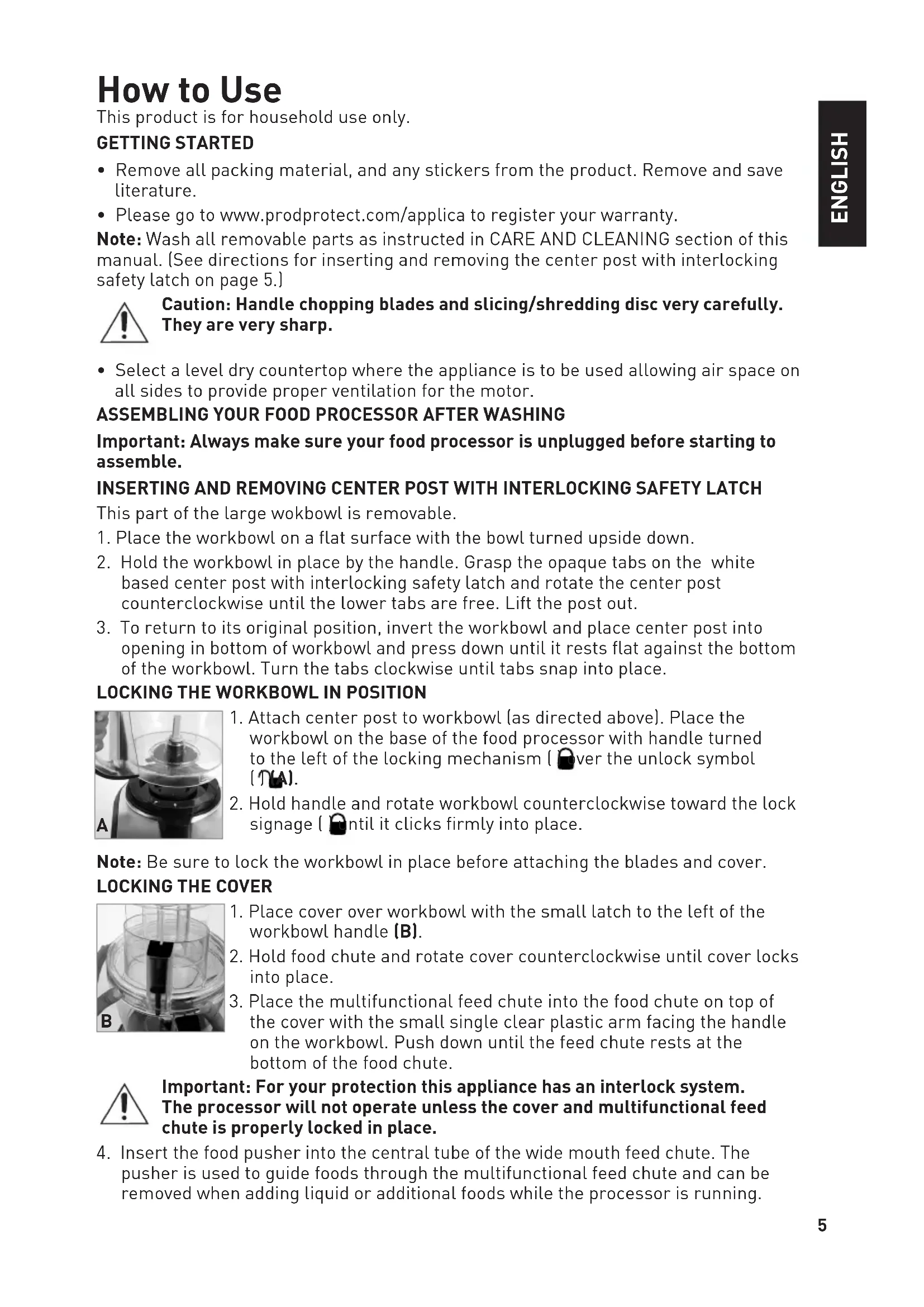 - Please go to www.prodprotect.com/applica to register your warranty. Note: Wash all removable parts as instructed in CARE AND CLEANING section of this manual. (See directions for inserting and removing the center post with interlocking safety latch on page 5.) Caution: Handle chopping blades and slicing/shredding disc very carefully. They are very sharp.