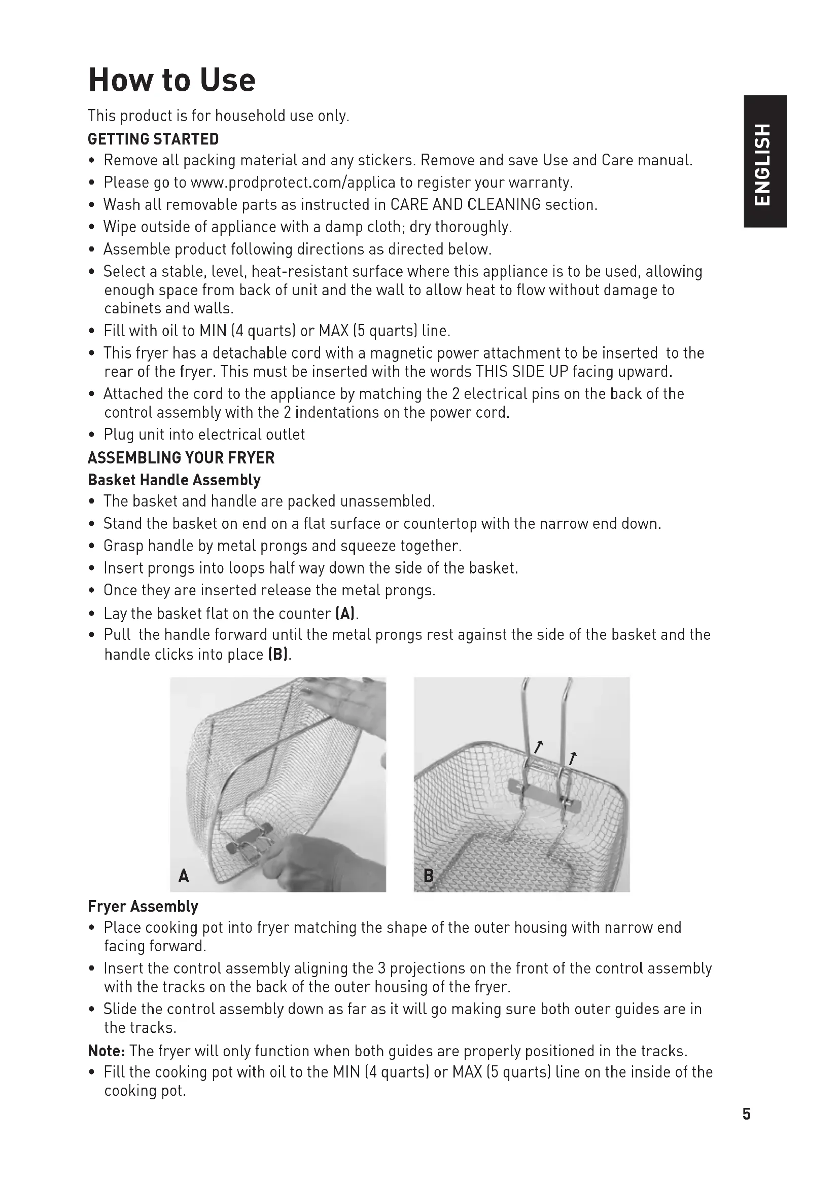 - Pull the handle forward until the metal prongs rest against the side of the basket and the handle clicks into place (B). Fryer Assembly