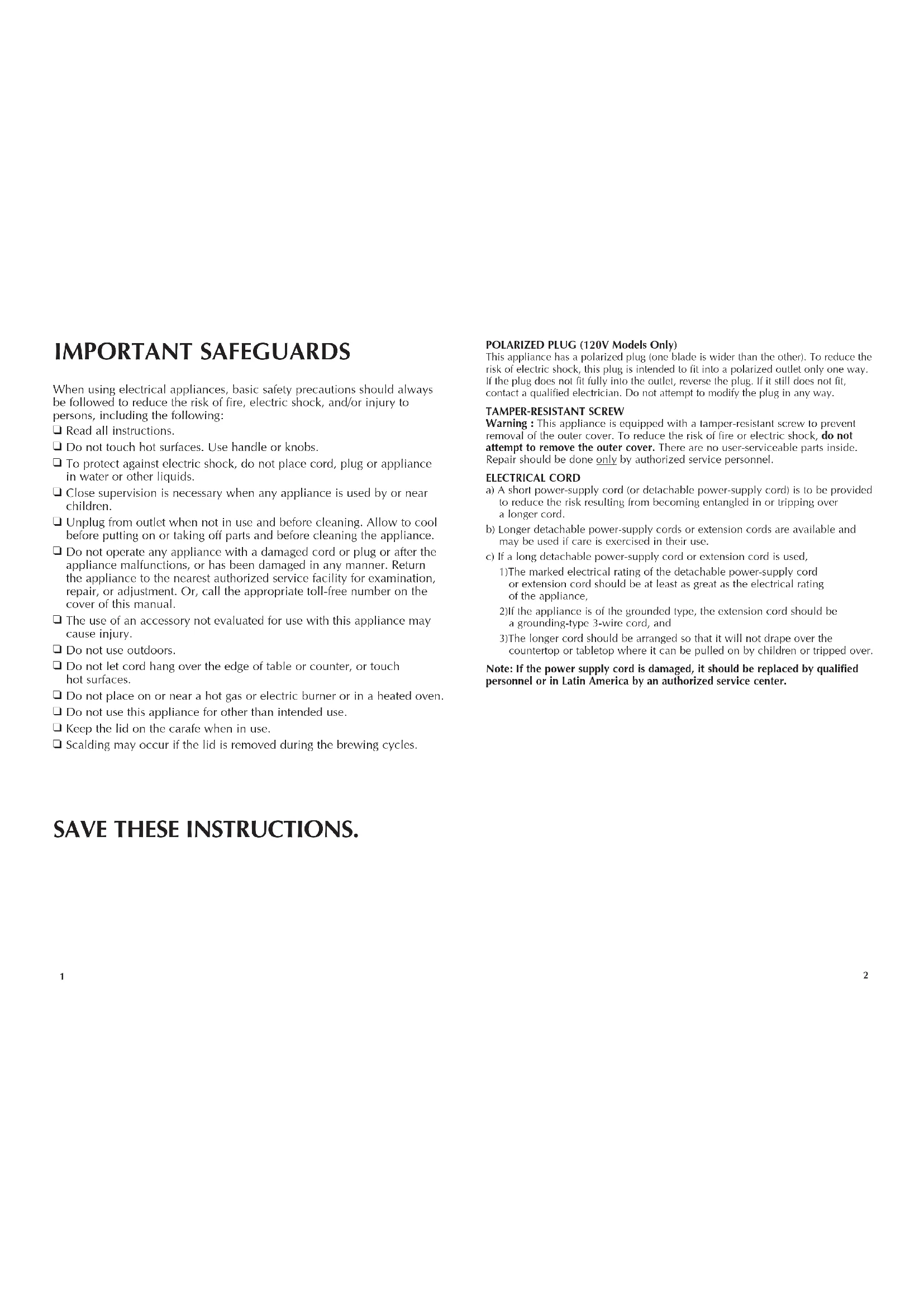 Scalding may occur if the lid is removed during the brewing cycles. SAVE THESE INSTRUCTIONS. POLARIZED PLUG (120V Models Only) This appliance has a polarized plug (one blade is wider than the other). To reduce the risk of electric shock, this plug is intended to fit into a polarized outlet only one way. If the plug does not fit fully into the outlet, reverse the plug. If it still does not fit, contact a qualified electrician. Do not attempt to modify the plug in any way. TAMPER-RESISTANT SCREW