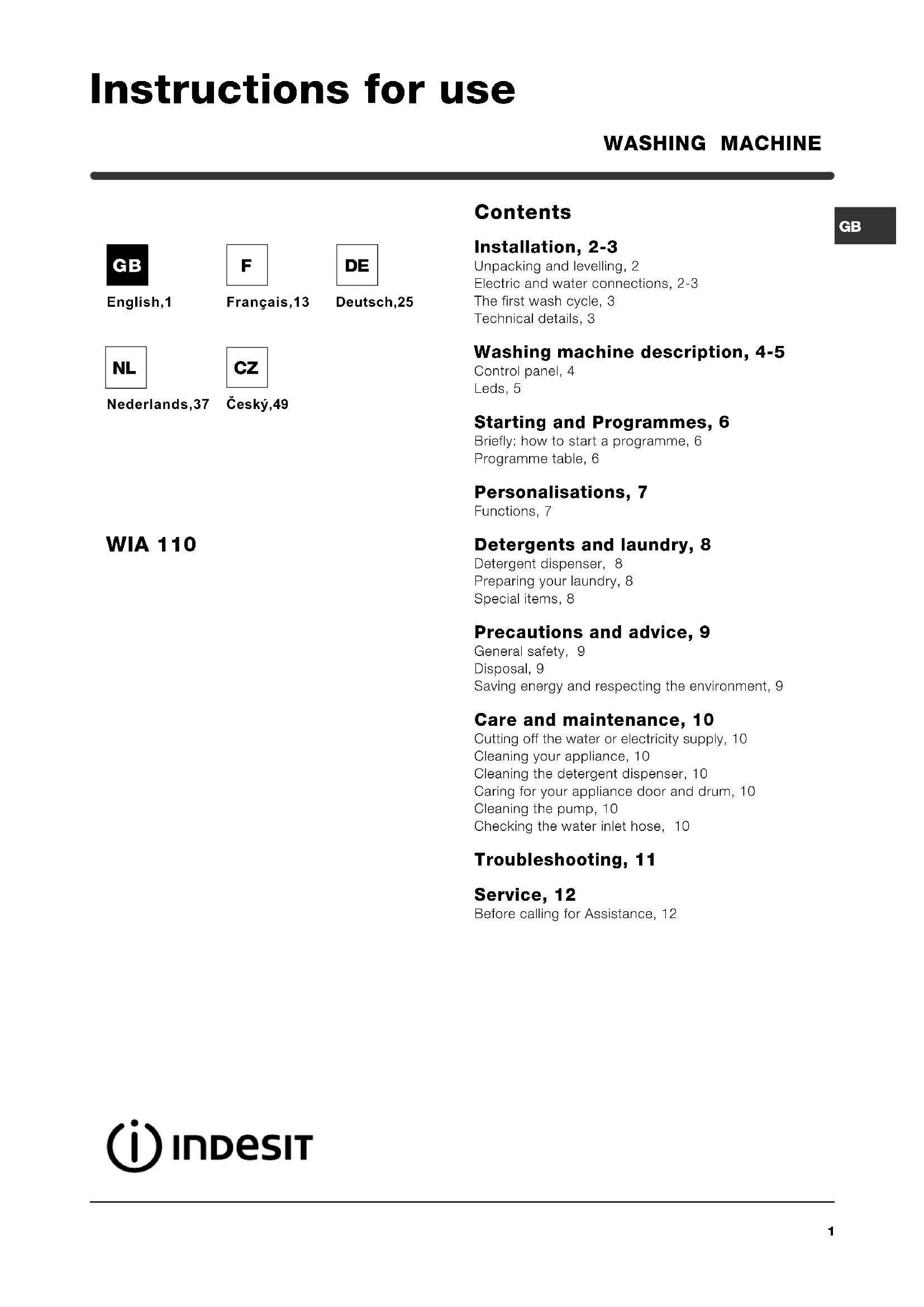 English,1 Contents Installation, 2-3 Unpacking and levelling, 2 Electric and water connections, 2-3 The first wash cycle, 3 Technical details, 3 Washing machine description, 4-5 Control panel, 4 Leds, 5 Starting and Programmes, 6 Briefly: how to start a programme, 6 Programme table, 6 Personalisations, 7 Functions, 7 Detergents and laundry, 8 Detergent dispenser, 8 Preparing your laundry, 8 Special items, 8 Precautions and advice, 9 General safety, 9 Disposal, 9 Saving energy and respecting the environment, 9 Care and maintenance, 10 Cutting off the water or electricity supply, 10 Cleaning your appliance, 10 Cleaning the detergent dispenser, 10 Caring for your appliance door and drum, 10 Cleaning the pump, 10 Checking the water inlet hose, 10 Troubleshooting, 11 Service, 12 Before calling for Assistance, 12 WASHING MACHINE WIA 110 Instructions for use