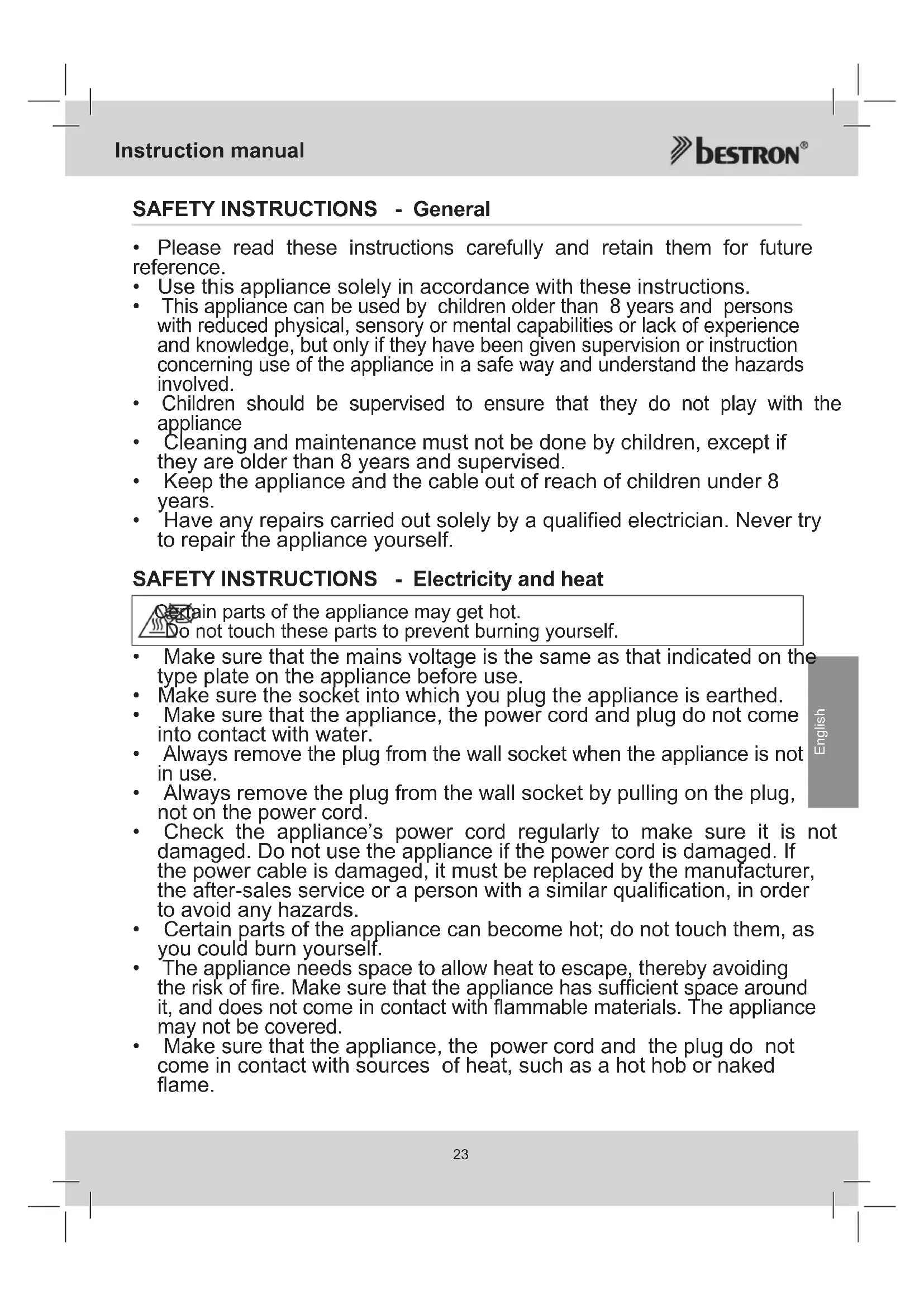 - Have any repairs carried out solely by a qualified electrician. Never try to repair the appliance yourself. SAFETY INSTRUCTIONS - Electricity and heat Certain parts of the appliance may get hot. Do not touch these parts to prevent burning yourself.