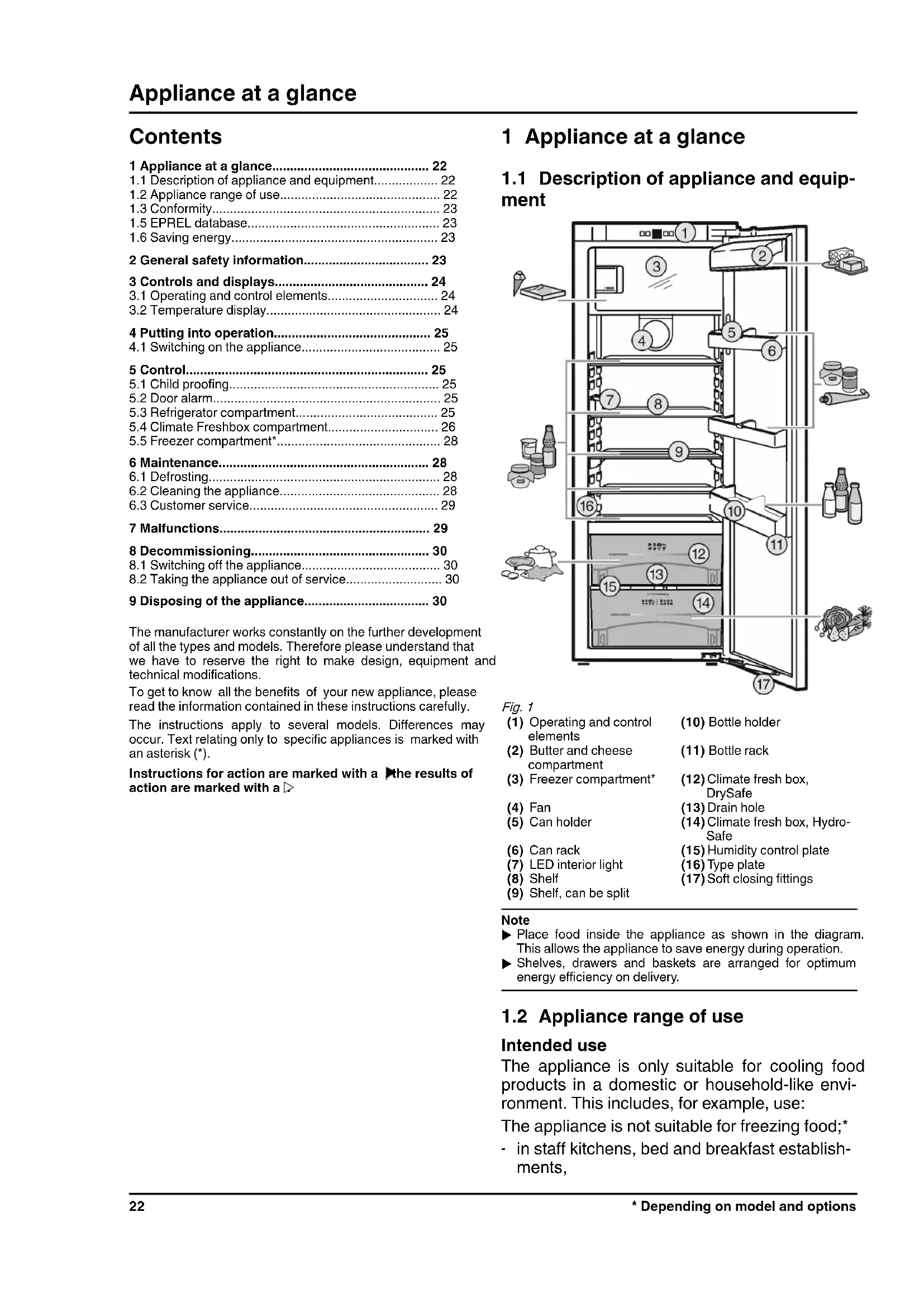 ment Fig. 1 (1) Operating and controlelements(10) Bottle holder(2) Butter and cheesecompartment(11) Bottle rack (3) Freezer compartment* (12) Climate fresh box, DrySafe (4) Fan (13) Drain hole (5) Can holder (14) Climate fresh box, Hydro- Safe (6) Can rack (15) Humidity control plate (7) LED interior light (16) Type plate (8) Shelf (17) Soft closing fittings (9) Shelf, can be split Note