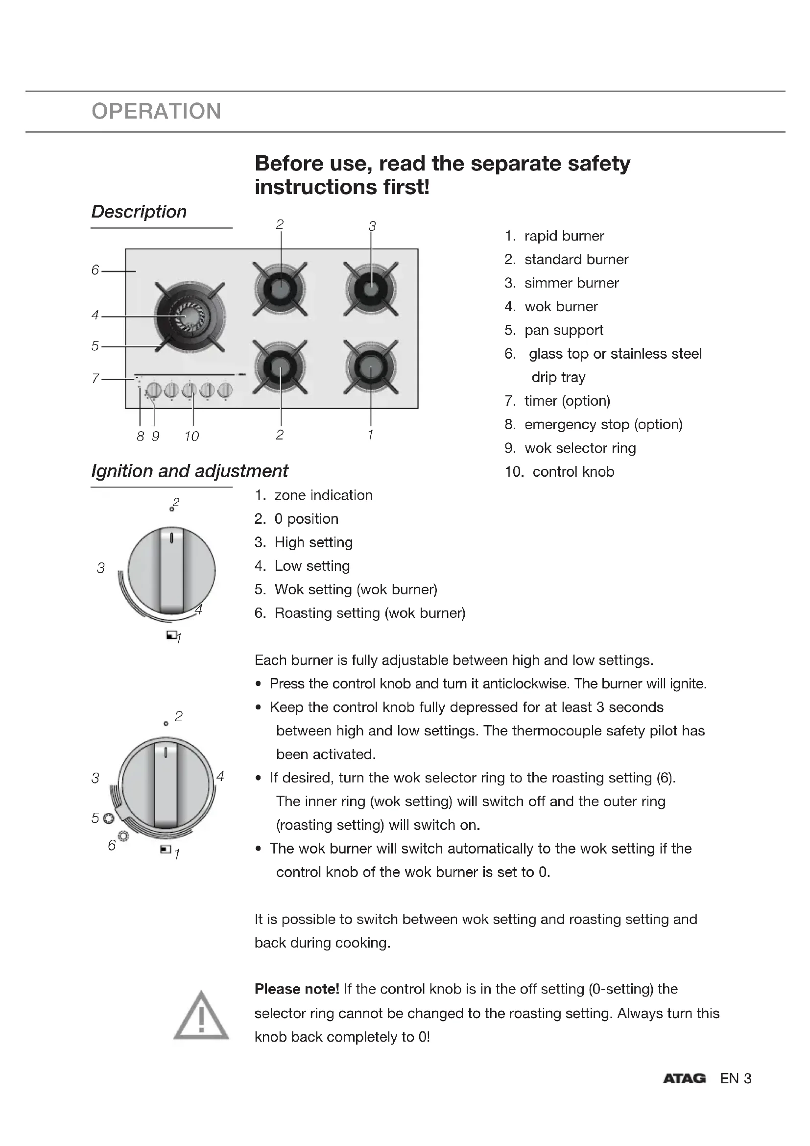- The wok burner will switch automatically to the wok setting if the control knob of the wok burner is set to 0. It is possible to switch between wok setting and roasting setting and back during cooking. Please note! If the control knob is in the off setting (0-setting) the selector ring cannot be changed to the roasting setting. Always turn this knob back completely to 0!
