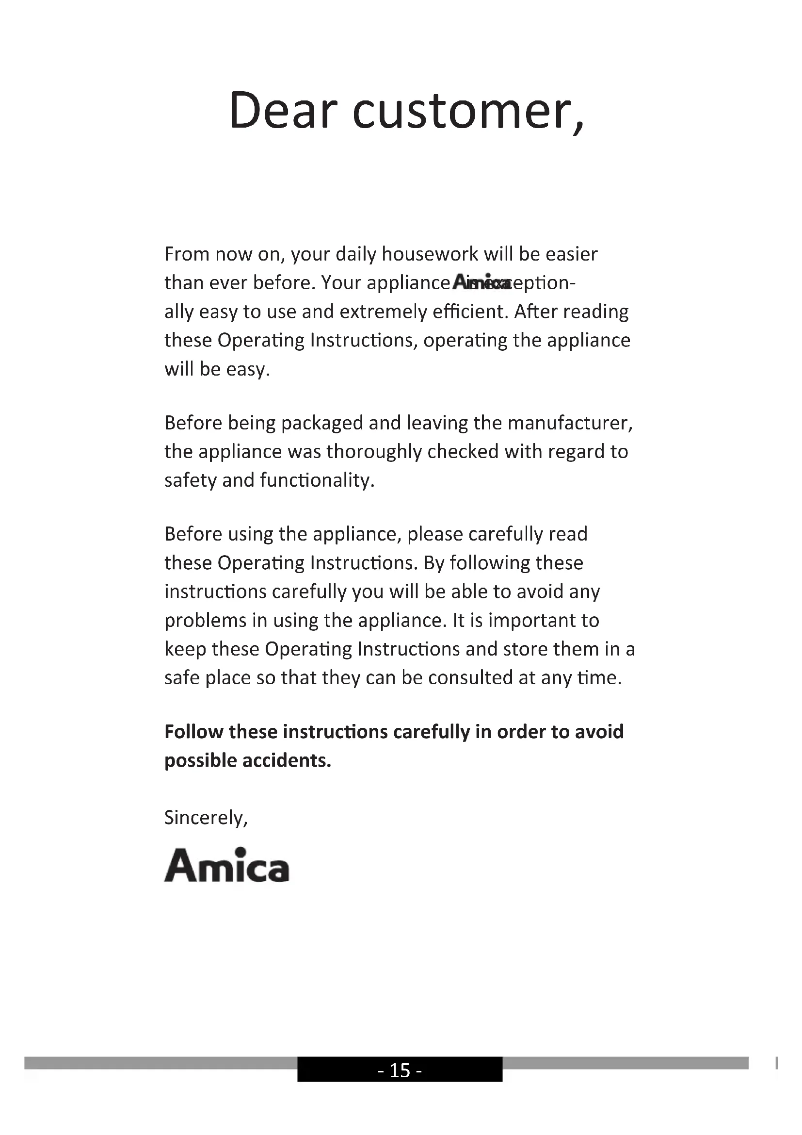 GARANCIA ÉS VÁSÁRLÁS UTÁNI SZERVIZ 268 GARANCIA 268- 15 - Dear customer, From now on, your daily housework will be easier than ever before. Your appliance is excepon- ally easy to use and extremely ecient. Aer reading these Operang Instrucons, operang the appliance will be easy. Before being packaged and leaving the manufacturer, the appliance was thoroughly checked with regard to safety and funconality. Before using the appliance, please carefully read these Operang Instrucons. By following these instrucons carefully you will be able to avoid any problems in using the appliance. It is important to keep these Operang Instrucons and store them in a safe place so that they can be consulted at any me. Follow these instrucons carefully in order to avoid possible accidents. Sincerely,- 16 - GUIDELINES CONCERNING