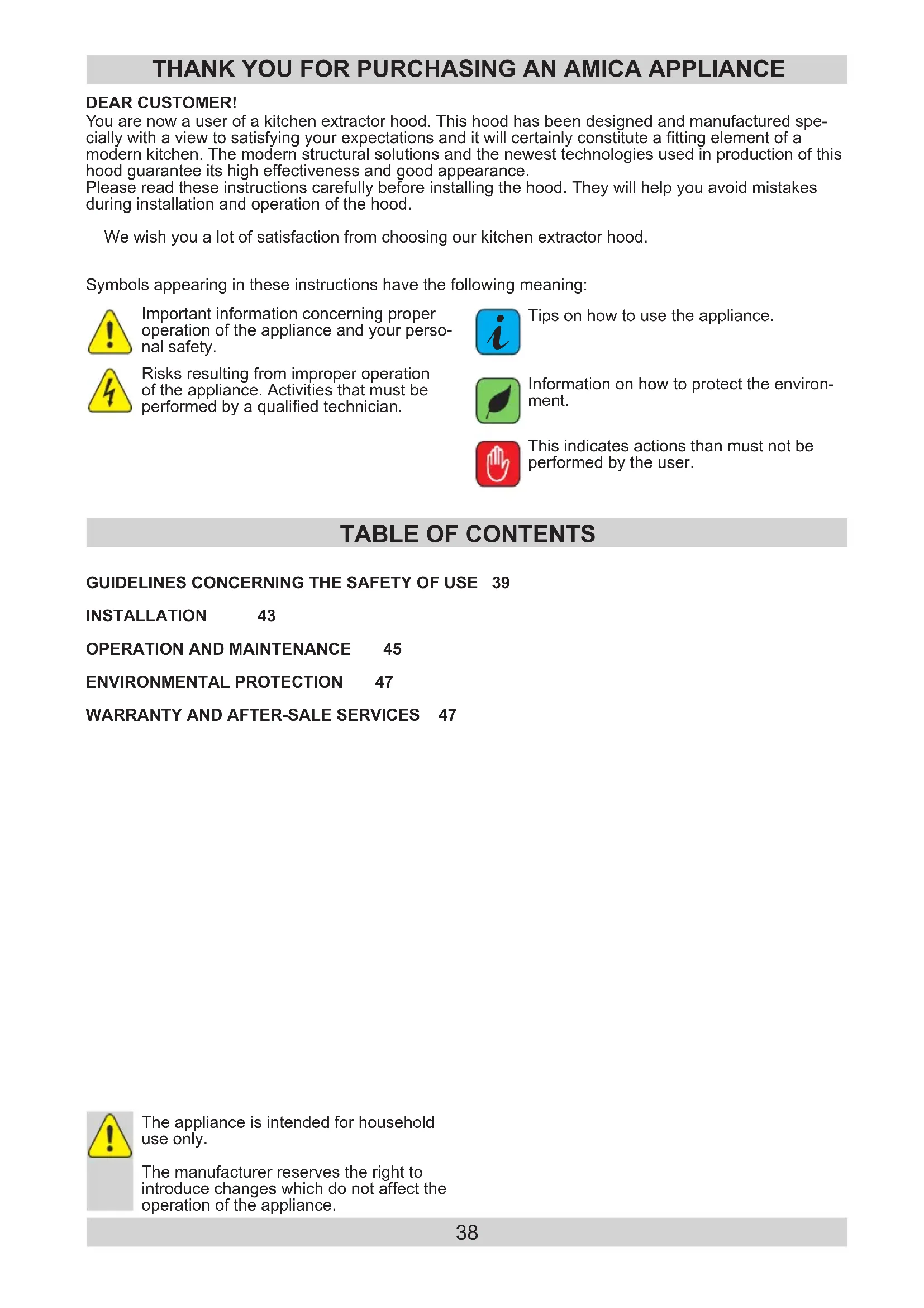 You are now a user of a kitchen extractor hood. This hood has been designed and manufactured spe- cially with a view to satisfying your expectations and it will certainly constitute a tting element of a modern kitchen. The modern structural solutions and the newest technologies used in production of this hood guarantee its high effectiveness and good appearance. Please read these instructions carefully before installing the hood. They will help you avoid mistakes during installation and operation of the hood. We wish you a lot of satisfaction from choosing our kitchen extractor hood. DEAR CUSTOMER! THANK YOU FOR PURCHASING AN AMICA APPLIANCE Symbols appearing in these instructions have the following meaning: This indicates actions than must not be performed by the user. Risks resulting from improper operation of the appliance. Activities that must be performed by a qualied technician. Important information concerning proper operation of the appliance and your perso- nal safety. Tips on how to use the appliance.
