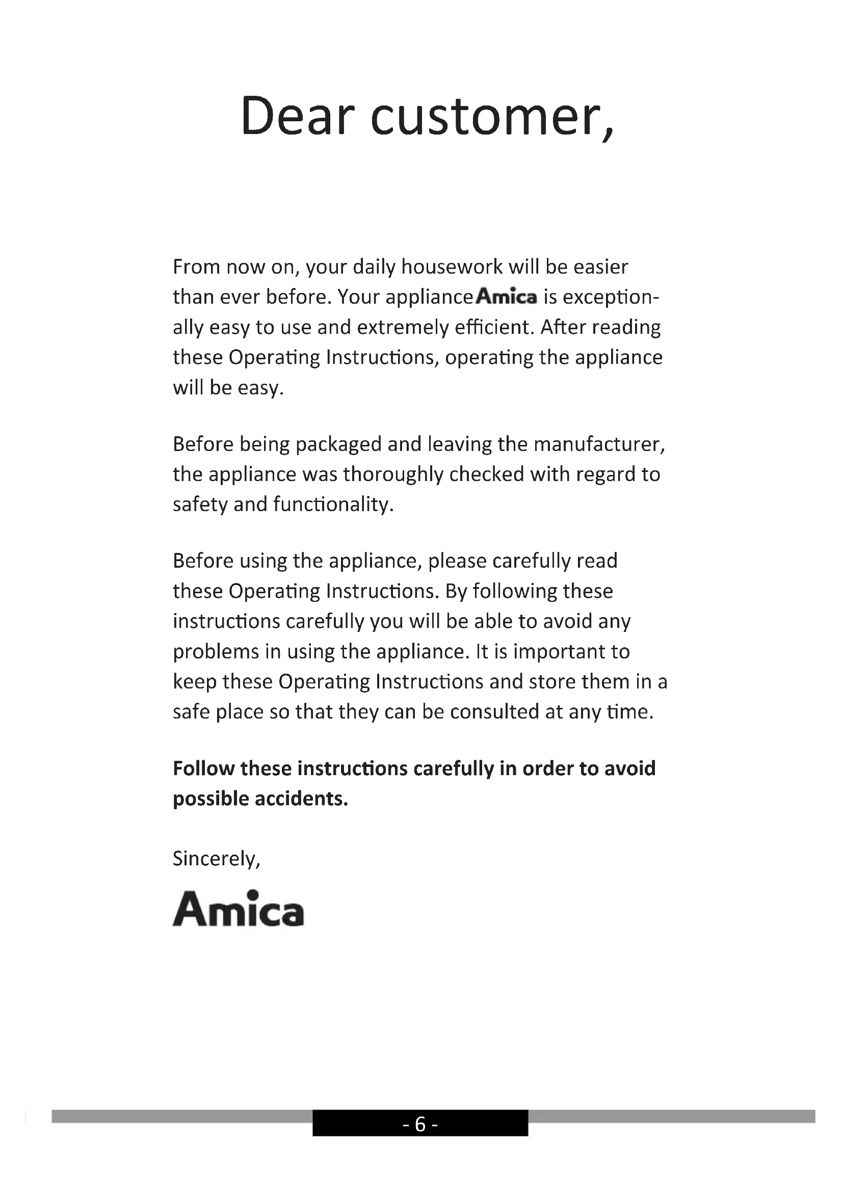 GARANCIJA 81- 6 - Dear customer, From now on, your daily housework will be easier than ever before. Your appliance is excepon- ally easy to use and extremely ecient. Aer reading these Operang Instrucons, operang the appliance will be easy. Before being packaged and leaving the manufacturer, the appliance was thoroughly checked with regard to safety and funconality. Before using the appliance, please carefully read these Operang Instrucons. By following these instrucons carefully you will be able to avoid any problems in using the appliance. It is important to keep these Operang Instrucons and store them in a safe place so that they can be consulted at any me. Follow these instrucons carefully in order to avoid possible accidents. Sincerely,- 7 -