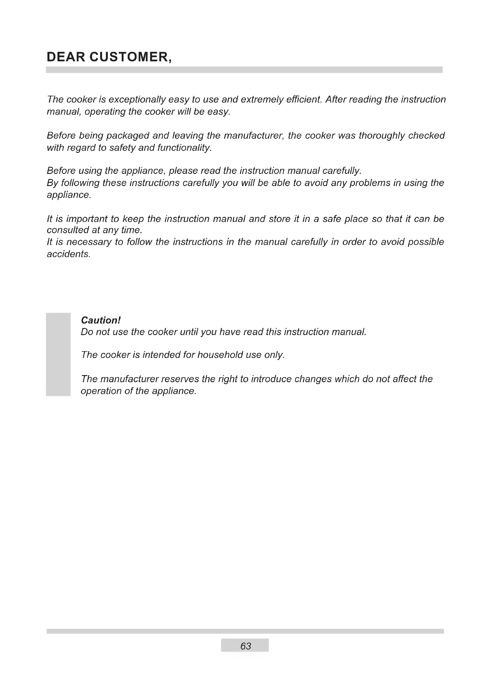 DEAR CUSTOMER, The cooker is exceptionally easy to use and extremely ecient. After reading the instruction manual, operating the cooker will be easy. Before being packaged and leaving the manufacturer, the cooker was thoroughly checked with regard to safety and functionality. Before using the appliance, please read the instruction manual carefully. By following these instructions carefully you will be able to avoid any problems in using the appliance. It is important to keep the instruction manual and store it in a safe place so that it can be consulted at any time. It is necessary to follow the instructions in the manual carefully in order to avoid possible accidents. Caution! Do not use the cooker until you have read this instruction manual. The cooker is intended for household use only. The manufacturer reserves the right to introduce changes which do not aect the operation of the appliance.64 SAFETY INSTRUCTIONS
