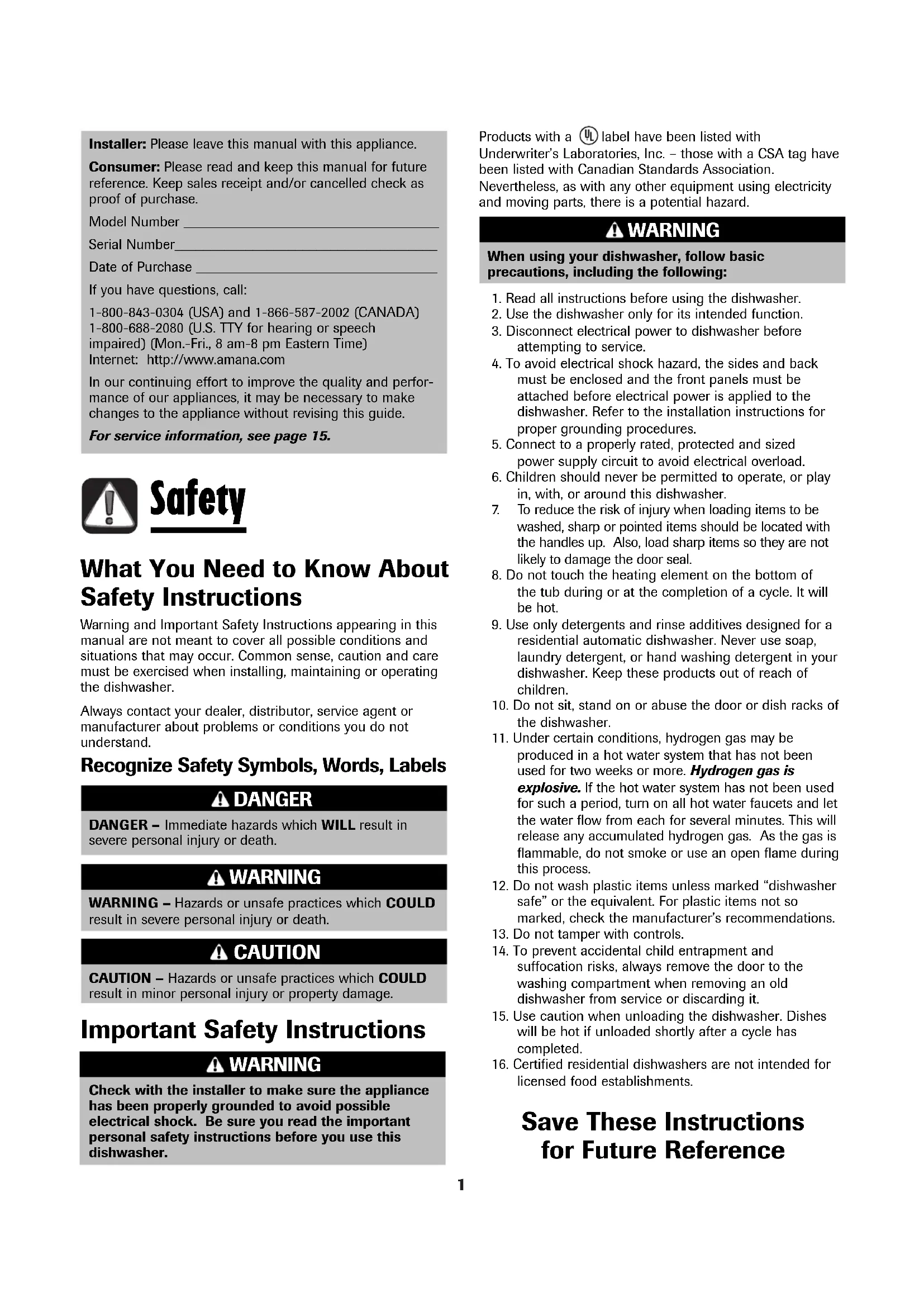 - Guía de Uso y Cuidado ADB-11 DANGER – Immediate hazards which WILL result in severe personal injury or death. DANGER WARNING – Hazards or unsafe practices which COULD result in severe personal injury or death. WARNING CAUTION – Hazards or unsafe practices which COULD result in minor personal injury or property damage. CAUTION Installer: Please leave this manual with this appliance. Consumer: Please read and keep this manual for future reference. Keep sales receipt and/or cancelled check as proof of purchase. Model Number ____________________________________ Serial Number_____________________________________ Date of Purchase __________________________________ If you have questions, call: 1-800-843-0304 (USA) and 1-866-587-2002 (CANADA) 1-800-688-2080 (U.S. TTY for hearing or speech impaired) (Mon.-Fri., 8 am-8 pm Eastern Time) Internet: http://www.amana.com In our continuing effort to improve the quality and perfor- mance of our appliances, it may be necessary to make changes to the appliance without revising this guide. For service information, see page 15. What You Need to Know About Safety Instructions Warning and Important Safety Instructions appearing in this manual are not meant to cover all possible conditions and situations that may occur. Common sense, caution and care must be exercised when installing, maintaining or operating the dishwasher. Always contact your dealer, distributor, service agent or manufacturer about problems or conditions you do not understand. Recognize Safety Symbols, Words, Labels Products with a label have been listed with Underwriter’s Laboratories, Inc. – those with a CSA tag have been listed with Canadian Standards Association. Nevertheless, as with any other equipment using electricity and moving parts, there is a potential hazard. p. 32
