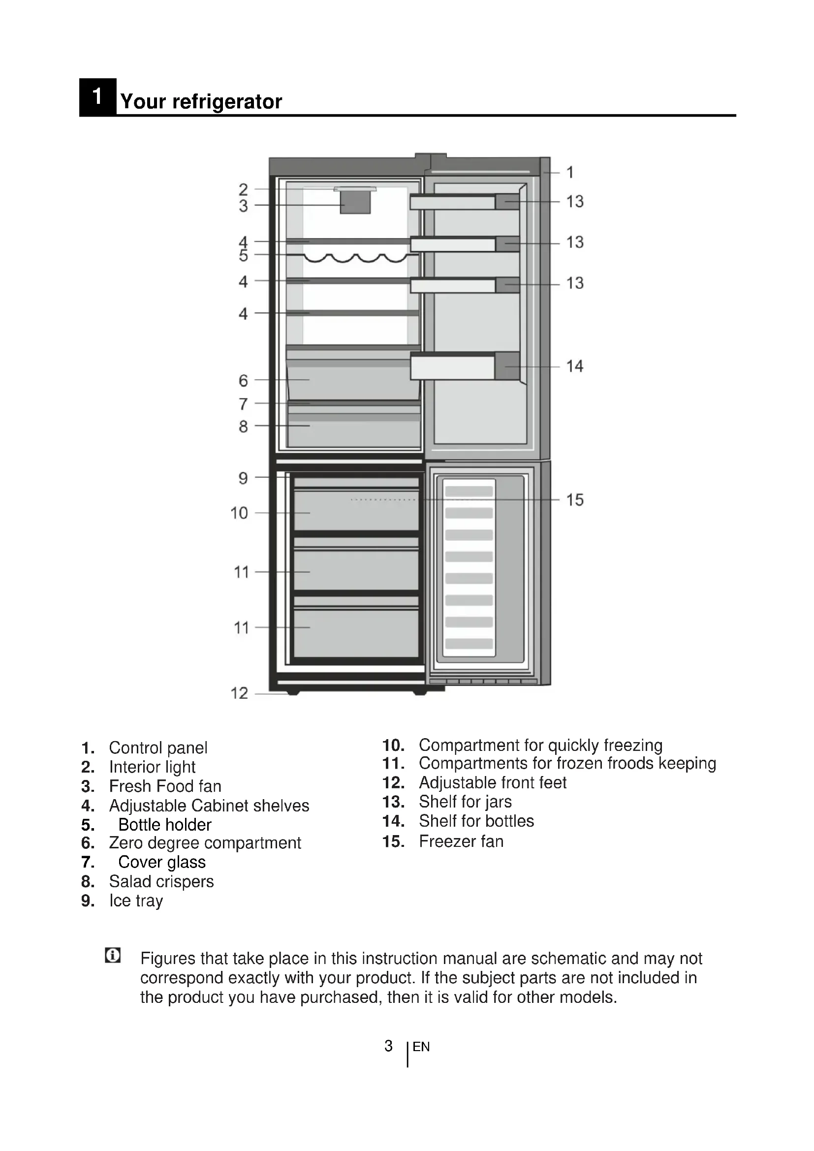 When energy saving function is activated, all symbols on the display other than energy saving symbol will turn off. When the Energy Saving function is activated, if any button is pressed or the door is opened, energy saving function will be canceled and the symbols on display will return to normal. Energy saving function is activated during delivery from factory and cannot be canceled. *Optional: The figures in this user guide are intended as drafts and may not perfectly match your product. If your product does not comprise the relevant parts, the information pertains to other models.12 EN 3.Quick fridge function Press this button to activate or deactivate the quick cool function ( ) Use quick cooling function when you want to quickly cool the food placed in the fridge compartment. If you want to cool large amounts of fresh food, activate this function before putting the food into the product. If you do not cancel it, quick cooling will cancel itself automatically after 1 hours or when the fridge compartment reaches to the required temperature. This function is not recalled when power restores after a power failure.