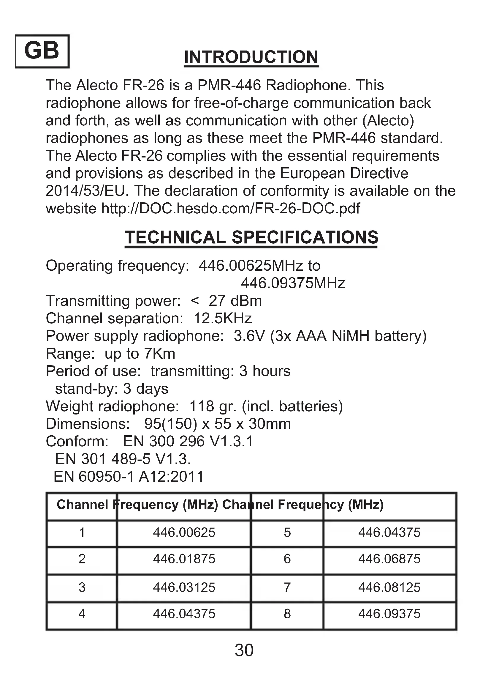 button to stop the monitoring function. KEY-LOCK: Press and hold the button for 2 seconds to enable the key-lock; press and hold the button again to disable the key-lock (enabled: the MENU, ▲ and ▼ buttons are locked while the symbol is illuminated)36 SUPPORTED FUNCTIONS BATTERY SAVING MODE: The FR-26 is provided with an automatic saving mode to extend the life span of the batteries. When the unit remains unused for 4 seconds, it’ll automatically switch to saving mode. When you start operating the PMR again or as soon as it receives a signal, the PMR will switch back to normal use. BATTERY CAPACITY MONITOR: When the FR-26 detects a low battery capacity, the display will indicate this through an icon. The PMR will emit two beep tones and then switch off automatically while the icon starts flashing. Please recharge the batteries by placing the walkie-talkie onto the charger. Recharge the batteries for 10 to 14 hours.36 37 USER TIPS GENERAL: The FR-26 is a transmitter/receiver working with radio waves on the 446 MHz band. Its signal transmission can be affected by external influences such as other radiophones, transmitters, wireless phones, etc. When your radiophone is being interfered with or causes interference, simply changing the channel usually solves this problem. The use of this radiophone is permitted in all the countries of the EU. If you want to bring the FR-26 to countries outside the EU, you should consult the local restrictions on the use of PMR446 equipment. Don’t forget that the signal of the FR-26 can also be heard by radiophones or receivers other than yours. It is in no way allowed to make any changes to the electronics or the antenna of the FR-26. Service must be performed by qualified service personnel only. Never use the FR-26 outdoors during thunderstorms.38 MAINTENANCE: - Only clean the FR-26 with a moist cloth. - Never place the radiophone in direct sunlight or humid environments. - Prevent water and/or sand from penetrating the FR-26. - In case of any problems, always check first whether the FR-26 does work correctly on a different location. RADIO CONNECTION: The FR-26 has an effective range from up to 7km. This range can be affected by local conditions such as high buildings, high voltage posts and overhead wires. An optimal range is achieved when the radiophone has a clear sight of the receiver. ENVIRONMENT: When discarding your radiophone, please return it to your dealer. They can guarantee environment-friendly disposal.38 39 WARRANTY CARD This ALECTO FR-26 is covered by a warranty of 24 months commencing on the day of your purchase. During this period we guarantee that any defects caused by errors in materials or construction will be repaired free of charge. The importer decides upon these conditions. HOT TO HANDLE: If you note any anomalies, first read the user’s manual. If you cannot find any solution to your problem, contact your retail or our after sales service: www.alecto.nl. WARRANTY COVERAGE TERMINATES : In the event of misuse, improper connection, battery leakage or incorrect placement of batteries. It does not cover the use of parts or accessories not delivered with this device, neglect or any failure caused by humidity, fire, flood, lightning or any natural disaster. The warranty does not cover alteration or modifications of the product by unauthorized qualified service personal. The warranty terminates in the event of incorrect transportation of the equipment without appropriate packaging or if the equipment is not accompanied by this warranty card and the receipt of purchase. Cables, jacks and batteries are not covered by the warranty. Alecto will not be held responsible for indirect, consequential or special damages.40 INTRODUCCION El Alecto FR-26 es un PMR-446 intercomunicador. Este intercomunicador le permite comunicarse de forma libre mutuamente con otros intercomunicadores (ALECTO) que por supuesto cumplan el estándar PMR-446. El Alecto PMR-446 cumple con los requisitos esenciales y las disposiciones establecidas en la Directiva 2014/53/EU. La declaración de conformidad está disponible en el sitio web http://DOC.hesdo.com/FR-26-DOC.pdf ESPECIFICACIONES TECNICAS Frecuencia: 446.00625MHz hasta 446.09375MHz Potencia de emisión: < 27 dBm Separación entre canales: 12.5KHz Alimentación: 3.6V (3 x AAA baterias NiMH) Rango: hasta 7Km Duración: emitiendo : hasta 3 horas standby: hasta 3 dias Peso: 118gr. (pilas incluidas) Dimensiones: 95(150) x 55 x 30mm Responde a: EN 300 296 V1.3.1 EN 301 489-5 V1.3.1 EN 60950-1 A12:2011 Canal Frecuencia (MHz) Canal Frecuencia (MHz)