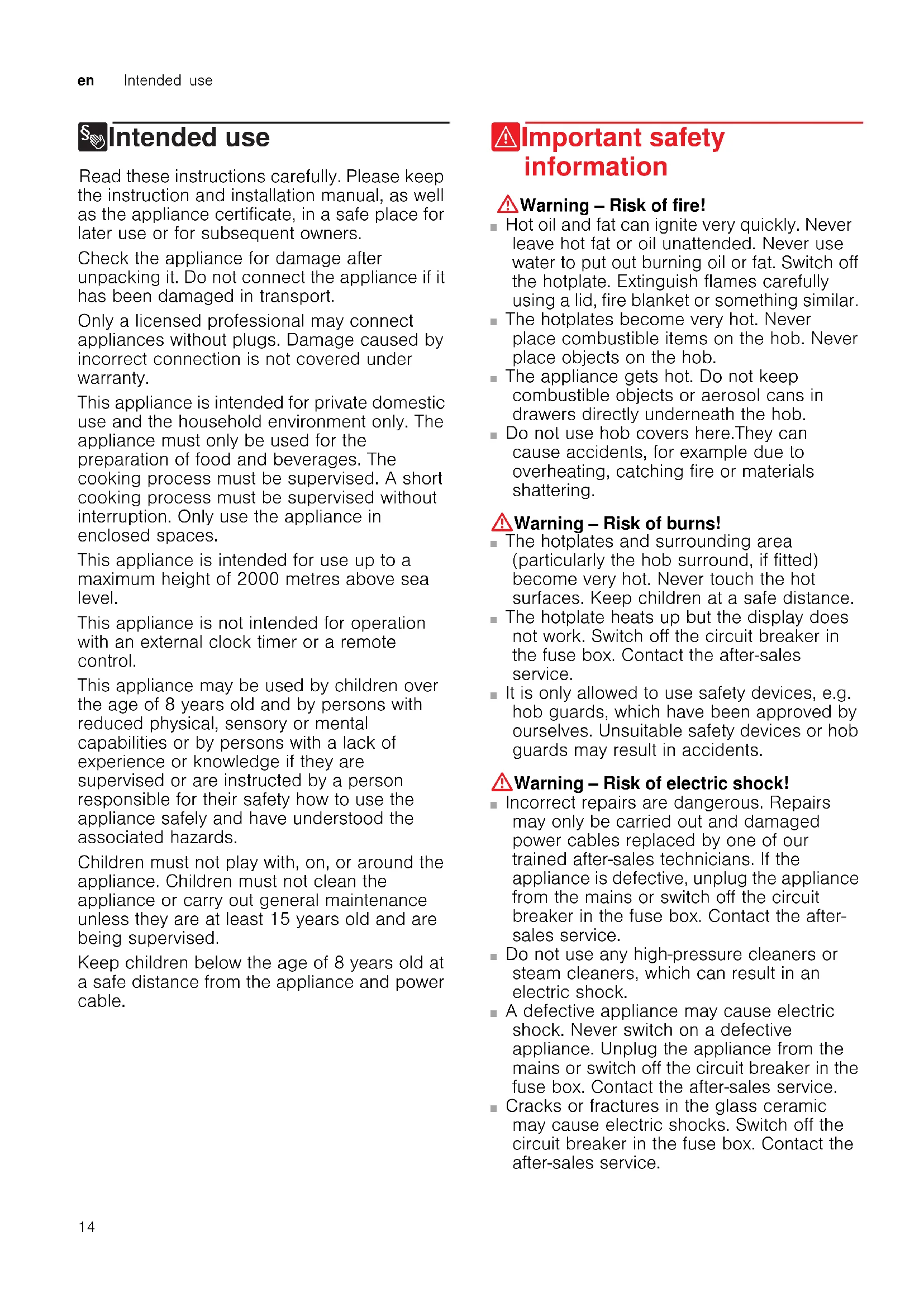 8Intended use Intended use Read these instructions carefully. Please keep the instruction and installation manual, as well as the appliance certificate, in a safe place for later use or for subsequent owners. Check the appliance for damage after unpacking it. Do not connect the appliance if it has been damaged in transport. Only a licensed professional may connect appliances without plugs. Damage caused by incorrect connection is not covered under warranty. This appliance is intended for private domestic use and the household environment only. The appliance must only be used for the preparation of food and beverages. The cooking process must be supervised. A short cooking process must be supervised without interruption. Only use the appliance in enclosed spaces. This appliance is intended for use up to a maximum height of 2000 metres above sea level. This appliance is not intended for operation with an external clock timer or a remote control. This appliance may be used by children over the age of 8 years old and by persons with reduced physical, sensory or mental capabilities or by persons with a lack of experience or knowledge if they are supervised or are instructed by a person responsible for their safety how to use the appliance safely and have understood the associated hazards. Children must not play with, on, or around the appliance. Children must not clean the appliance or carry out general maintenance unless they are at least 15 years old and are being supervised. Keep children below the age of 8 years old at a safe distance from the appliance and power cable. (Important safety information Impor t ant saf et y informat i on :Warning – Risk of fire! ■ Hot oil and fat can ignite very quickly. Never leave hot fat or oil unattended. Never use water to put out burning oil or fat. Switch off the hotplate. Extinguish flames carefully using a lid, fire blanket or something similar. Risk of fire! ■ The hotplates become very hot. Never place combustible items on the hob. Never place objects on the hob. Risk of fire! ■ The appliance gets hot. Do not keep combustible objects or aerosol cans in drawers directly underneath the hob. Risk of burns! ■ Do not use hob covers here.They can cause accidents, for example due to overheating, catching fire or materials shattering. :Warning – Risk of burns! ■ The hotplates and surrounding area (particularly the hob surround, if fitted) become very hot. Never touch the hot surfaces. Keep children at a safe distance. Risk of burns! ■ The hotplate heats up but the display does not work. Switch off the circuit breaker in the fuse box. Contact the after-sales service. Risk of burns! ■ It is only allowed to use safety devices, e.g. hob guards, which have been approved by ourselves. Unsuitable safety devices or hob guards may result in accidents. :Warning – Risk of electric shock! ■ Incorrect repairs are dangerous. Repairs may only be carried out and damaged power cables replaced by one of our trained after-sales technicians. If the appliance is defective, unplug the appliance from the mains or switch off the circuit breaker in the fuse box. Contact the after- sales service. Risk of electric shock! ■ Do not use any high-pressure cleaners or steam cleaners, which can result in an electric shock. Risk of electric shock! ■ A defective appliance may cause electric shock. Never switch on a defective appliance. Unplug the appliance from the mains or switch off the circuit breaker in the fuse box. Contact the after-sales service. Risk of electric shock! ■ Cracks or fractures in the glass ceramic may cause electric shocks. Switch off the circuit breaker in the fuse box. Contact the after-sales service.Causes of damage en