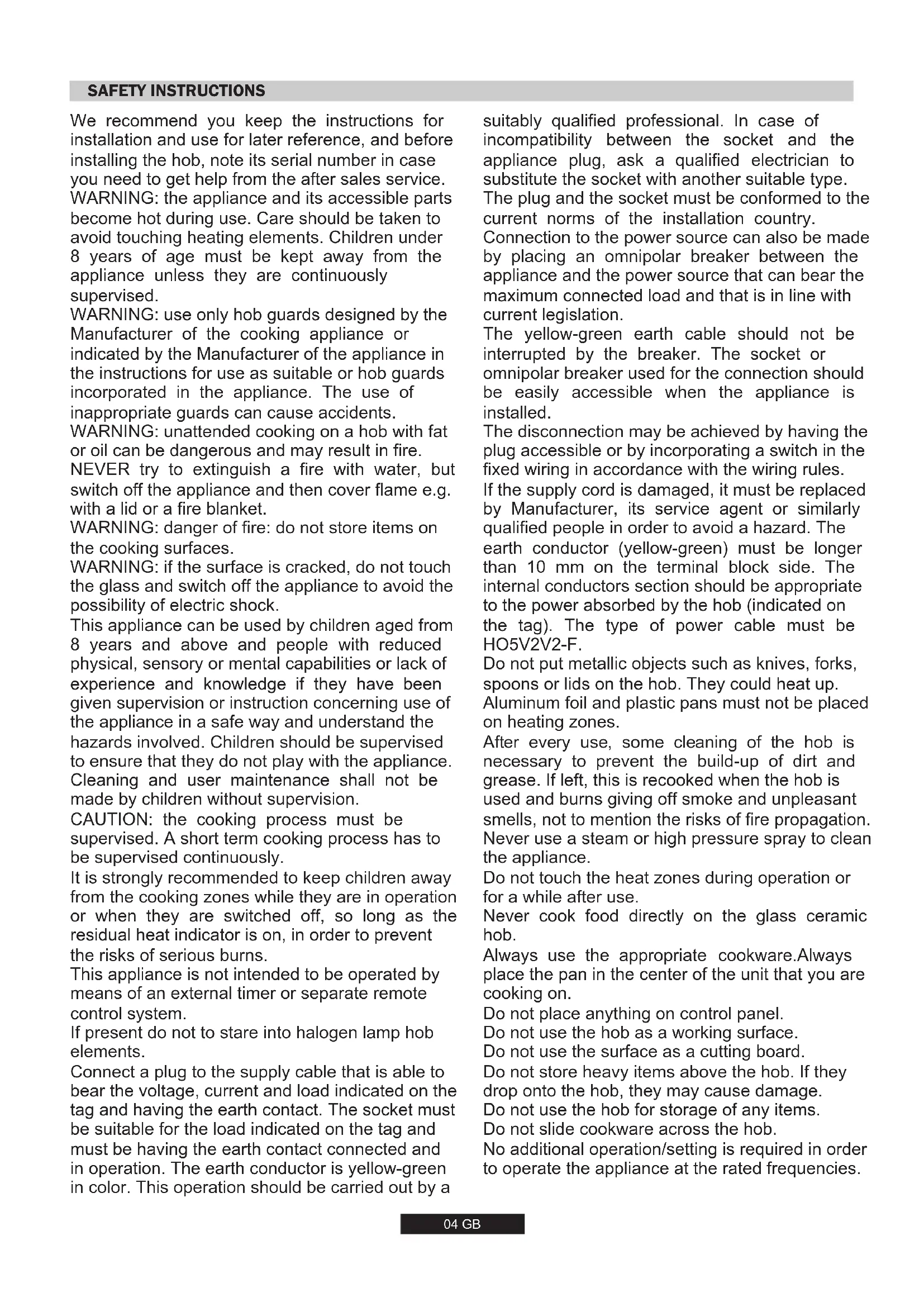 the glass and switch off the appliance to avoid the possibility of electric shock. This appliance is not intended to be operated by means of an external timer or separate remote control system. SAFETY INSTRUCTIONS No additional operation/setting is required in order to operate the appliance at the rated frequencies. If the supply cord is damaged, it must be replaced by Manufacturer, its service agent or similarly qualified people in order to avoid a hazard. The earth conductor (yellow-green) must be longer than 10 mm on the terminal block side. The internal conductors section should be appropriate to the power absorbed by the hob (indicated on the tag). The type of power cable must be HO5V2V2-F. Aluminum foil and plastic pans must not be placed on heating zones. suitably qualified professional. In case of incompatibility between the socket and the appliance plug, ask a qualified electrician to substitute the socket with another suitable type. The plug and the socket must be conformed to the current norms of the installation country. Connection to the power source can also be made by placing an omnipolar breaker between the appliance and the power source that can bear the maximum connected load and that is in line with current legislation. Do not place anything on control panel. The yellow-green earth cable should not be interrupted by the breaker. The socket or omnipolar breaker used for the connection should be easily accessible when the appliance is installed. The disconnection may be achieved by having the plug accessible or by incorporating a switch in the fixed wiring in accordance with the wiring rules. Do not put metallic objects such as knives, forks, spoons or lids on the hob. They could heat up. After every use, some cleaning of the hob is necessary to prevent the build-up of dirt and grease. If left, this is recooked when the hob is used and burns giving off smoke and unpleasant smells, not to mention the risks of fire propagation. Do not touch the heat zones during operation or for a while after use. Never cook food directly on the glass ceramic hob. Never use a steam or high pressure spray to clean the appliance. Always use the appropriate cookware.Always place the pan in the center of the unit that you are cooking on. Do not use the hob as a working surface. Do not use the surface as a cutting board. Do not store heavy items above the hob. If they drop onto the hob, they may cause damage. Do not use the hob for storage of any items. Do not slide cookware across the hob. 04 GBLeave a distance of at least 55 mm between the hob and the back wall and of at least 150 mm between the hob and the vertical furniture or walls in the lateral side. If a furniture is installed above the hob, the minimum distance required is 700 mm. (see Figure 3) If the bottom part of the hob is adjacent to an area normally accessible for handling or cleaning operations, a separator it must be put 20 mm below the bottom part of the hob. (see Figure 4) When installing a hood above the hob, please consult the installation requirements specified for the hood but, in any case, the distance between the hob and the hood must not be lower than 700 mm. When installing an oven under the hob, separator must not be put and the minimum distance between the bottom part of the hob and the oven must not be lower than 10 mm. Do not install not cooled oven under this hob and install the oven following its own installation requirements. (see Figure 5) PRODUCT CODE TIdentification Plate (located under the hob's bottom casing)