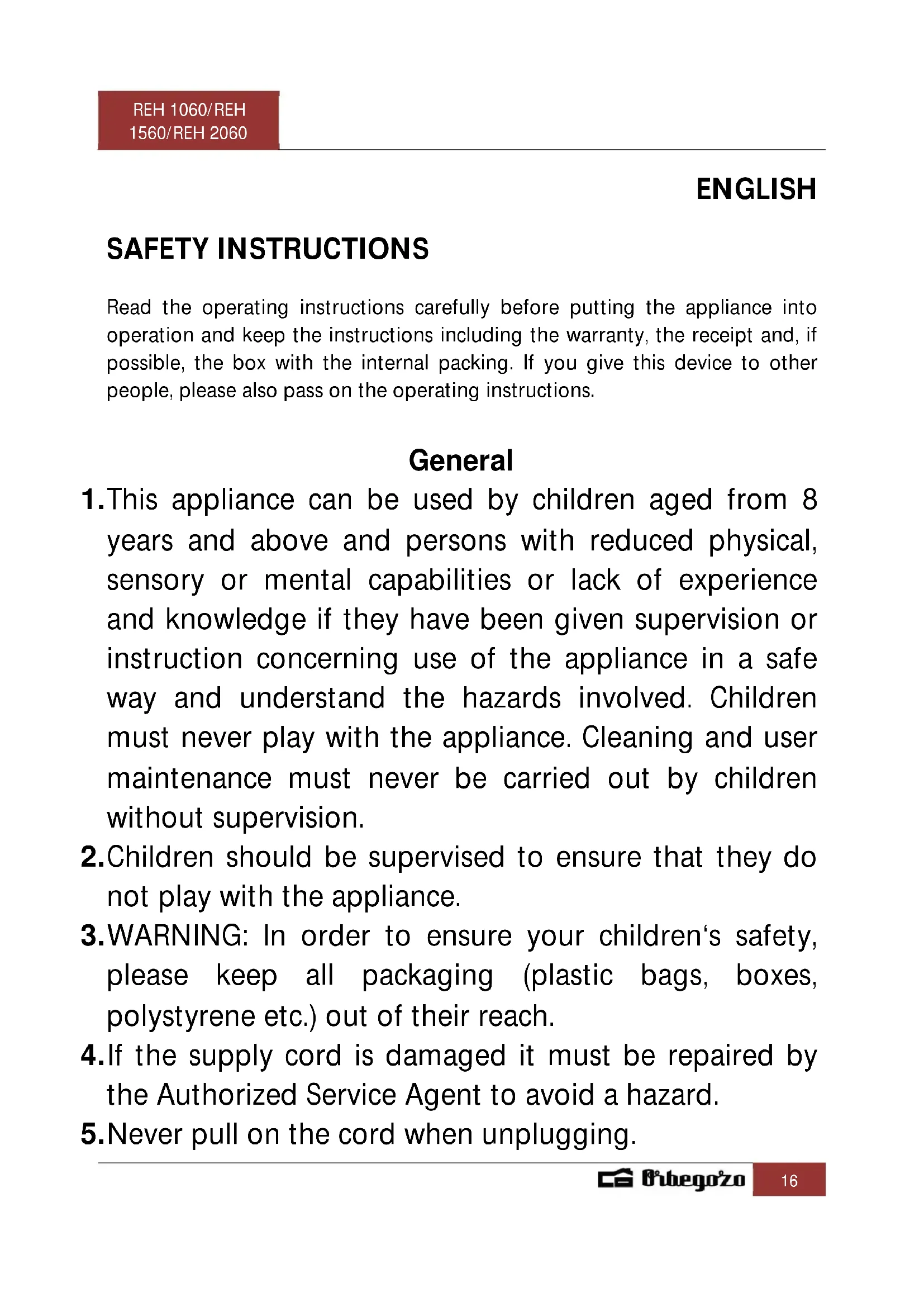 been placed or installed in its intended normal operating position and they have been given supervision or instruction concerning use of the appliance in a safe way and understand the hazards involved. Children aged from 3 years and less than 8 years shall not plug in, regulate and clean the appliance or perform user maintenance. − CAUTION: Some parts of this product can become very hot and cause burns. Particular attention has to be given where children and vulnerable people are present. − The device should not be placed immediately below a socket base. − Do not place a heater in use near curtains, furniture, wood paneling or combustible material which can deteriorate with heat. − Do not use this heater in the immediate vicinity of a bath, shower or pool. − Check if the voltage indicated on the bottom of the appliance corresponds to the local mains voltage before you connect the appliance. − The appliance must be connected to an earthed mains outlet. If you wish to use an extension cord, a 3- wire type is suitable.REH 1060/REH 1560/REH 2060